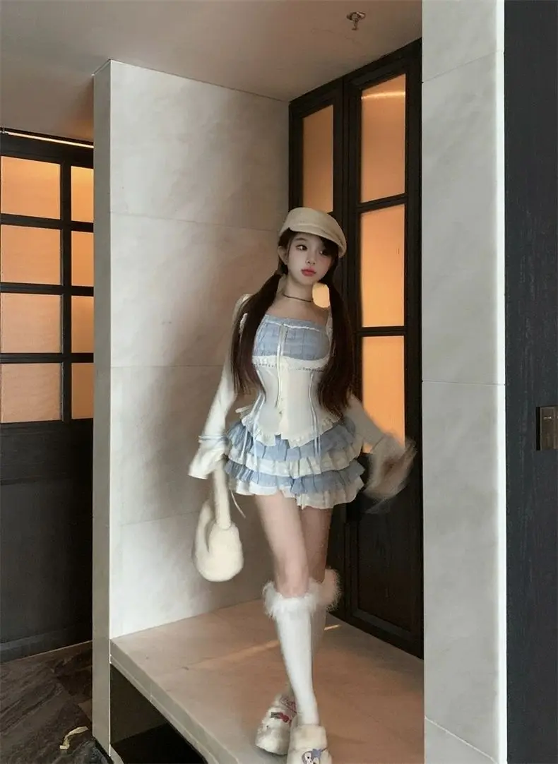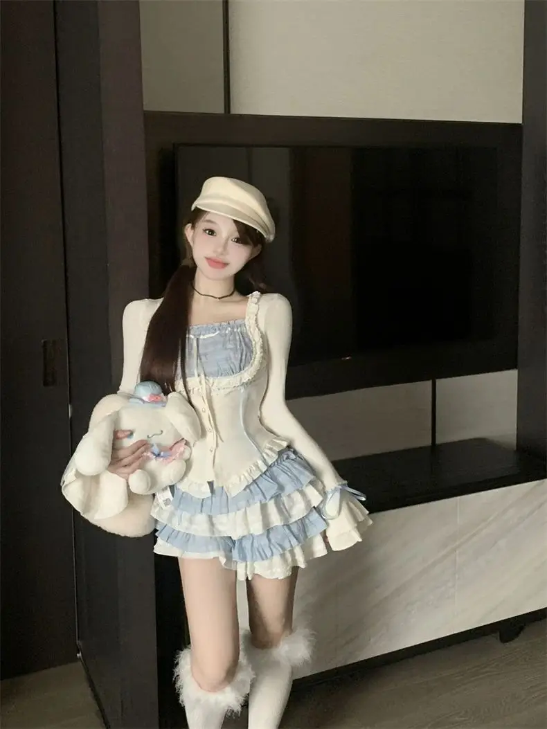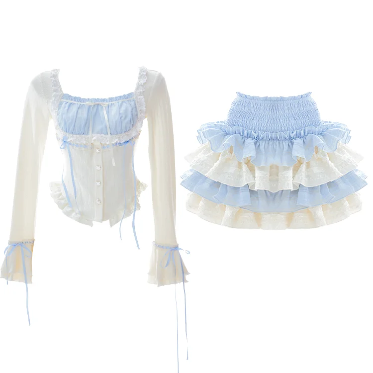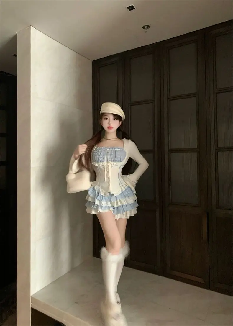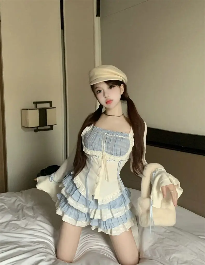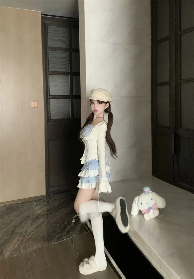 LIZAKOSHT - Set Skirt Crop Tops Blouse + Mini Skirts 2024 Autumn Casuall Japanese Style Y2k Vintage Lolita Kawaii Suits