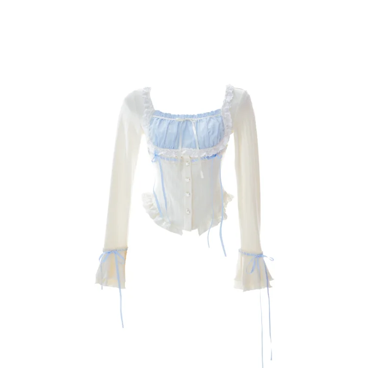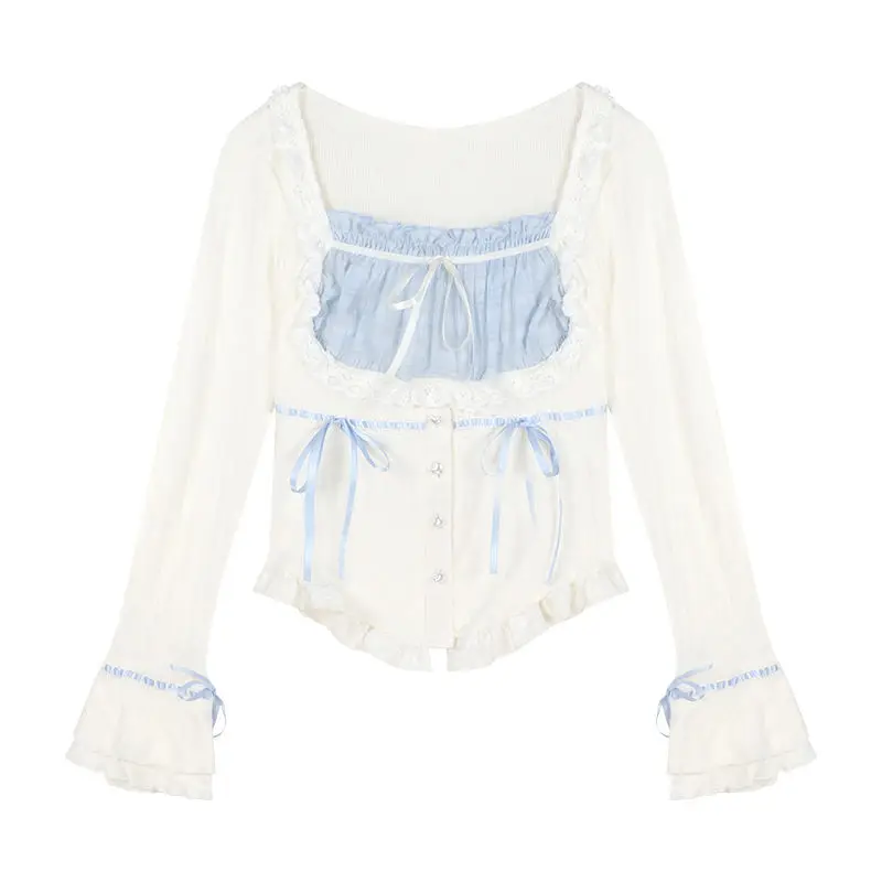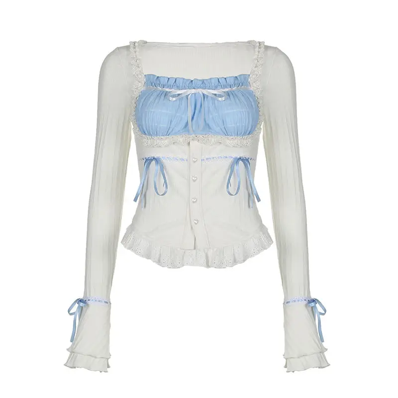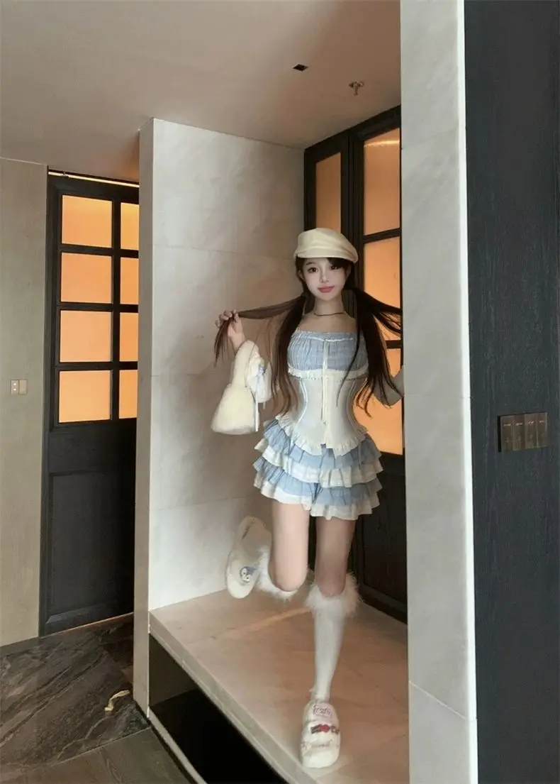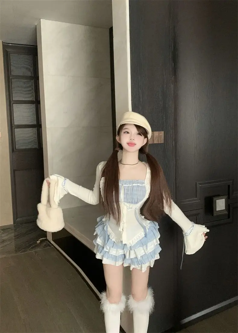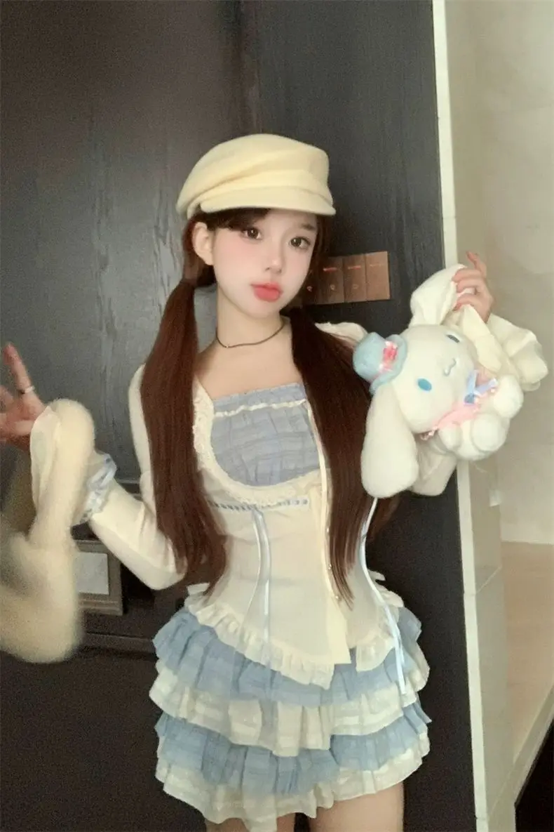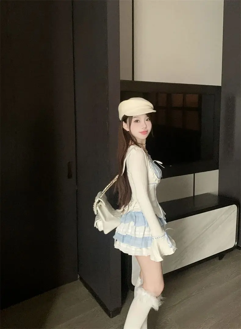 LIZAKOSHT - Set Skirt Crop Tops Blouse + Mini Skirts 2024 Autumn Casuall Japanese Style Y2k Vintage Lolita Kawaii Suits