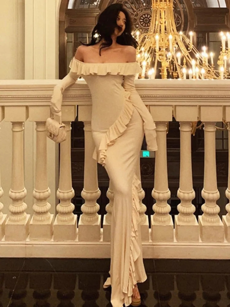 LIZAKOSHT - Sexy Bodycon Off Shoulder Long Dresses for Women Solid Ruffles Slim Mermaid Slit Evening Party Bandage Dress Prom Robe Vestidos