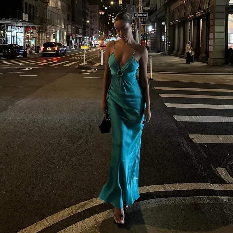 LIZAKOSHT - Sexy Deep V-neck Women Hollow Out Sling Dress Fashion Sleeveless Backless Slim Maxi Dresses 2024 Lady Solid Party Evening Robes