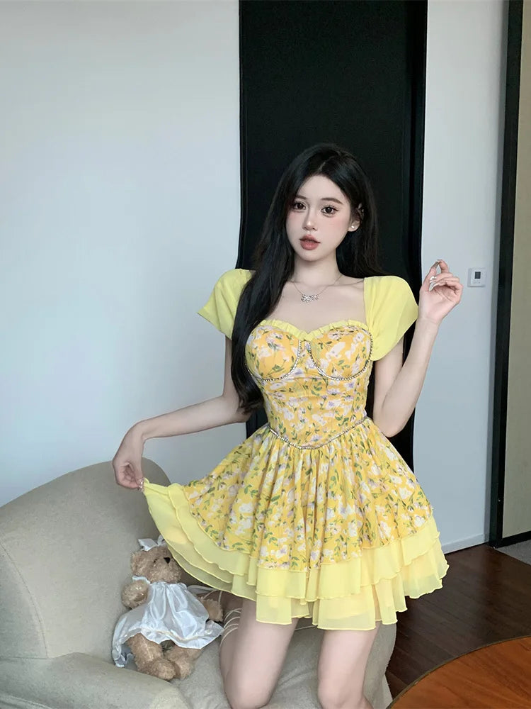 LIZAKOSHT - Sexy Dresses Women Floral Printed Patchwork Chain Ruffles Layered Square Collar Elegant Mini Dress Slim Fashion Female