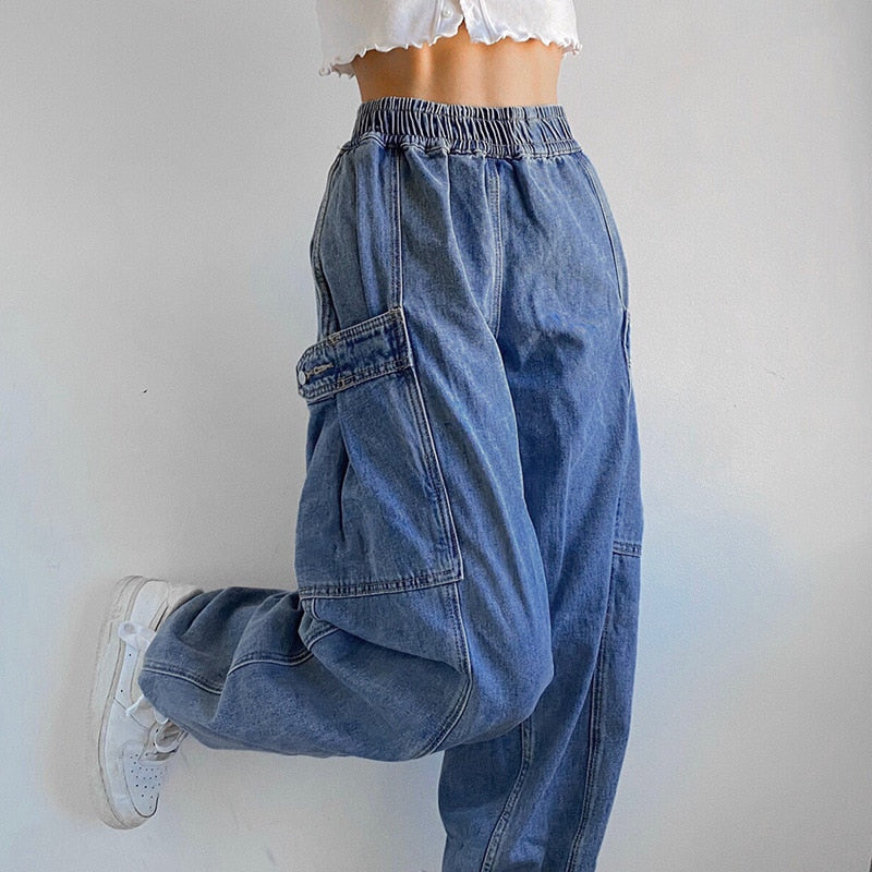 Lizakosht Sexy Fashion Cargo Trousers Ins Street Solid Vintage Work Jeans Elastic Waist Straight Leg Jeans Workwear Femme Mujer