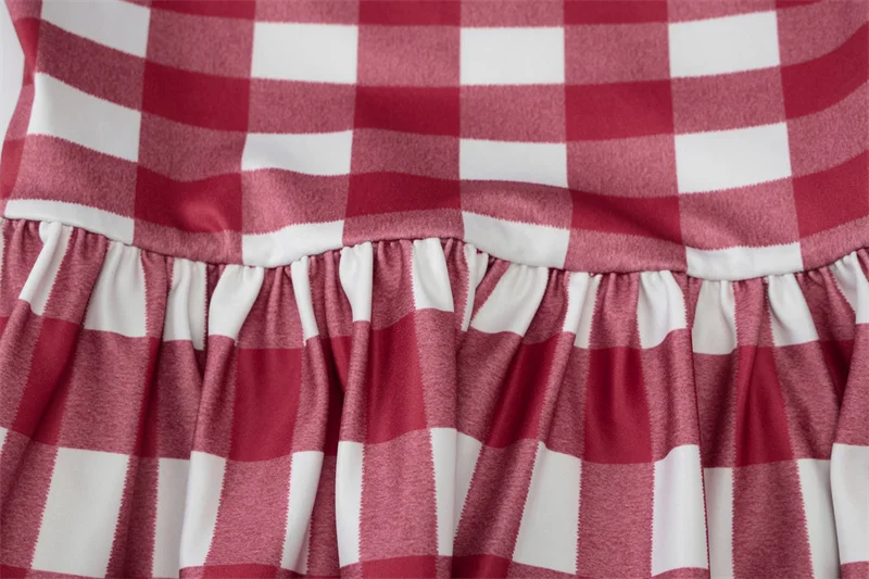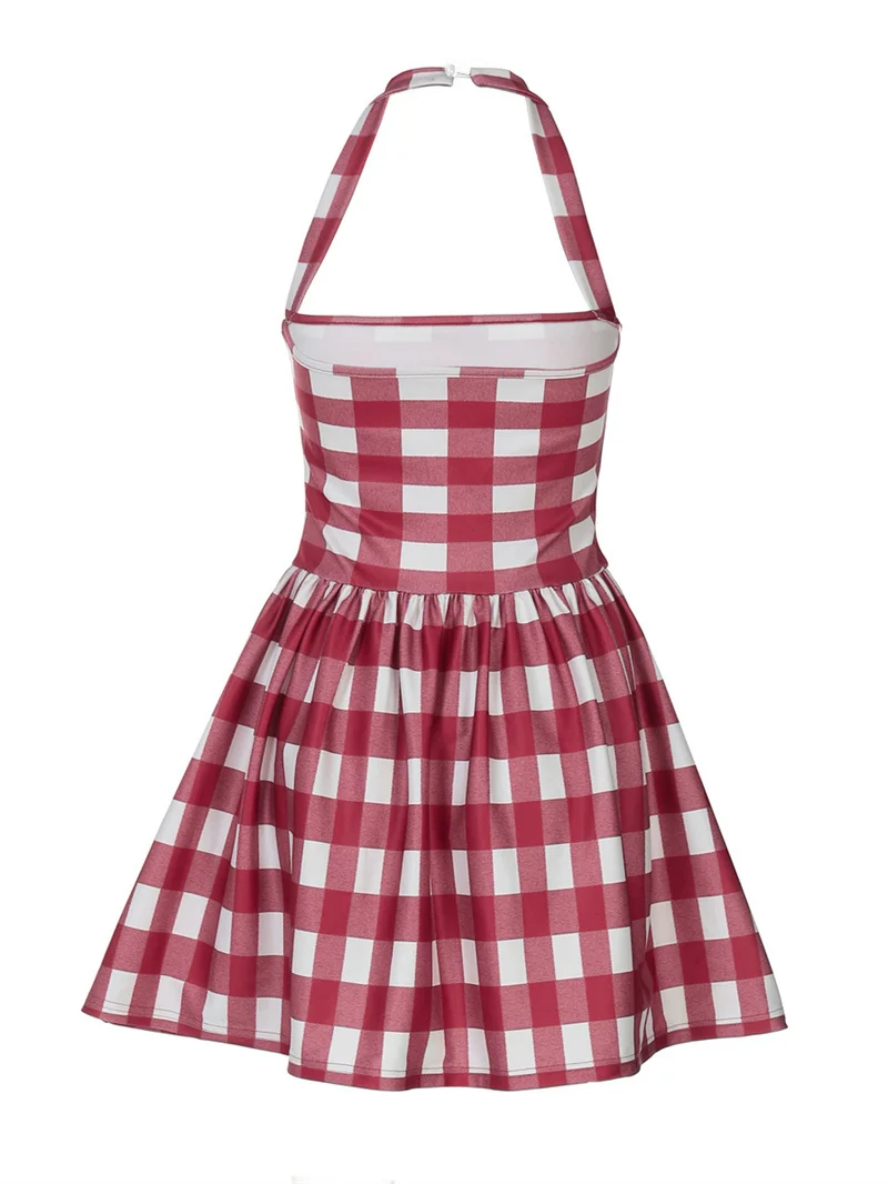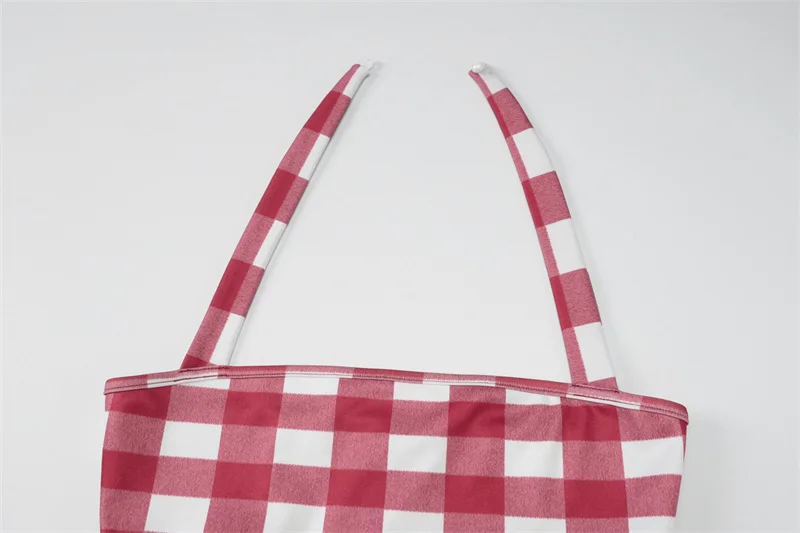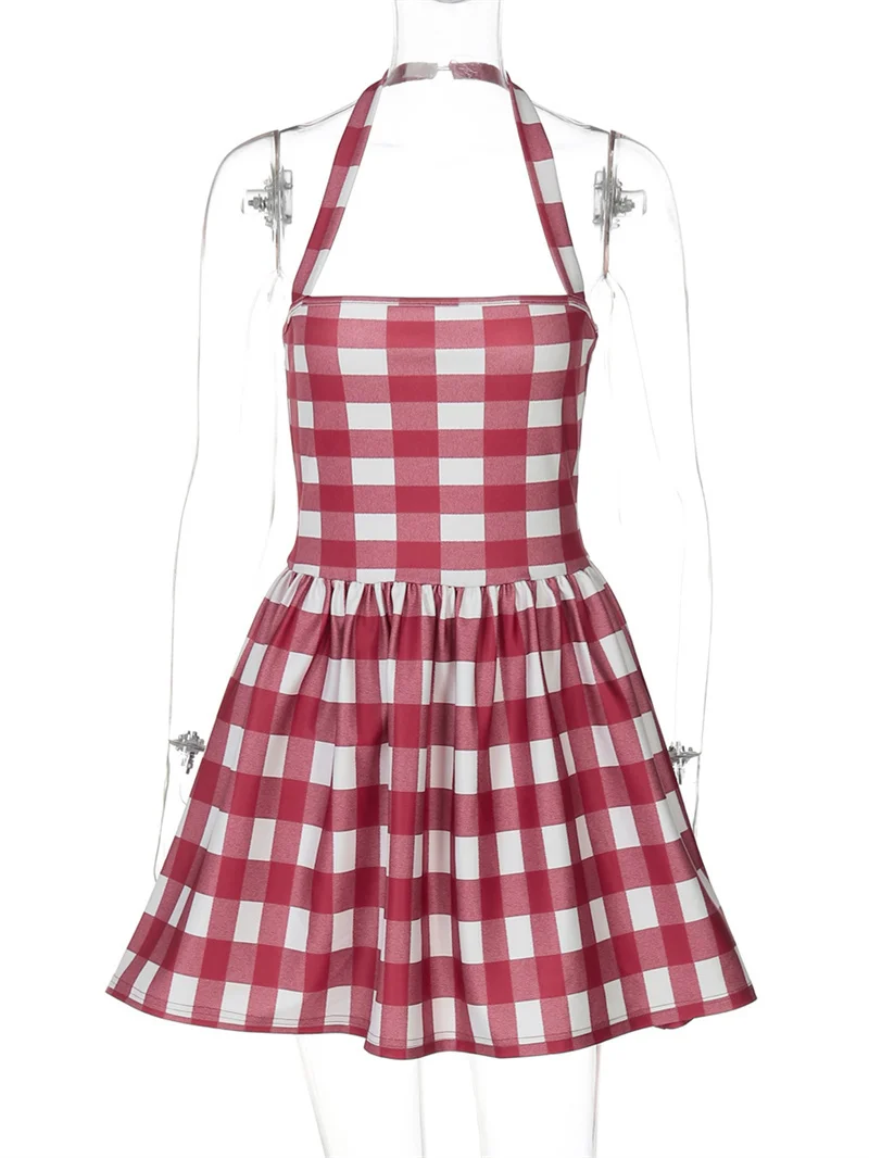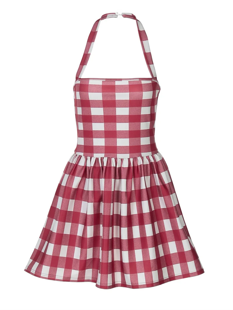 LIZAKOSHT - Sexy Halter Plaid Print Mini Dress Off-shoulder Sleeveless Spaghetti Strap Backless High Waist Red A-line Holiday Dress