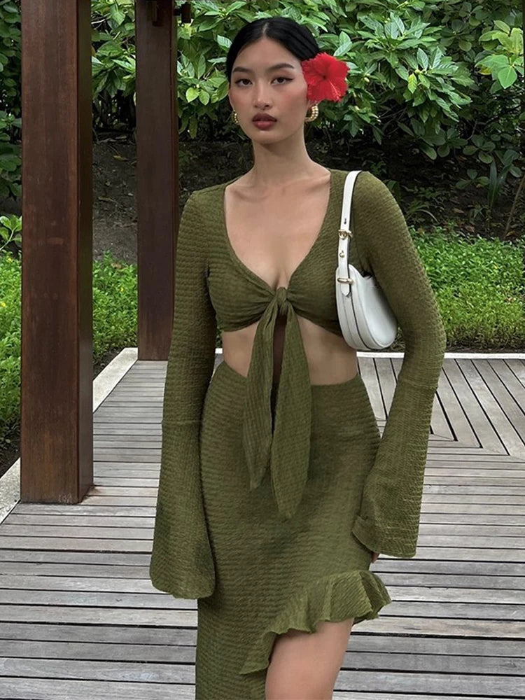 LIZAKOSHT - Sexy Irregular Skirt Women Set Fashion V-neck Lace Up Long Sleeve Short Top Suit Female High Waist Asymmetry Midi Skirts Outfits