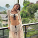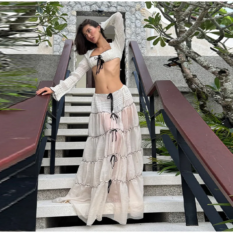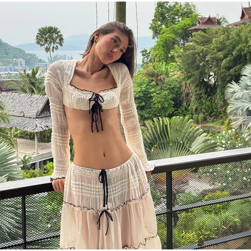 LIZAKOSHT  -  Sexy Lace Up Short Tops Skirt 2pcs Women Sets Slim Long Sleeve Crop Top With Chiffon Ruffle Long Skirt Lady Summer Chic Robes
