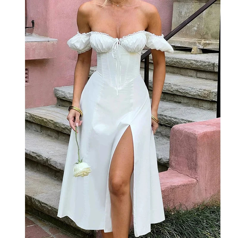 LIZAKOSHT - Sexy Off Shoulder Elegant White Dress For Women Sweet Lace Trim Short Sleeve Female Slit Hem Midi Party Dresses Summer Robe