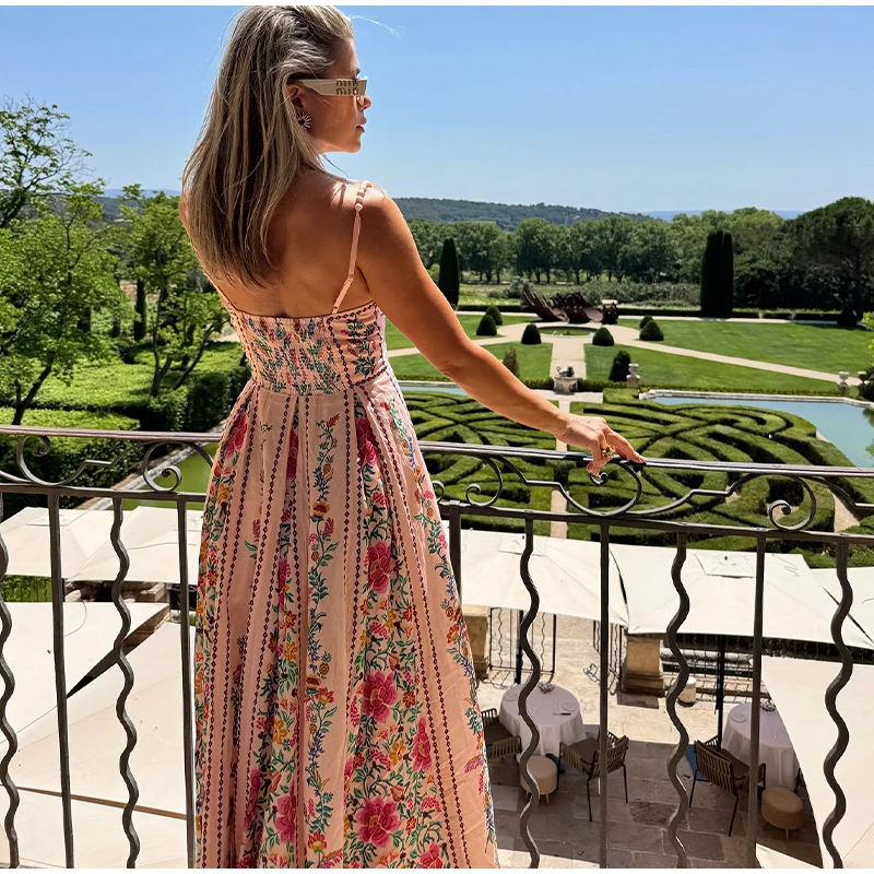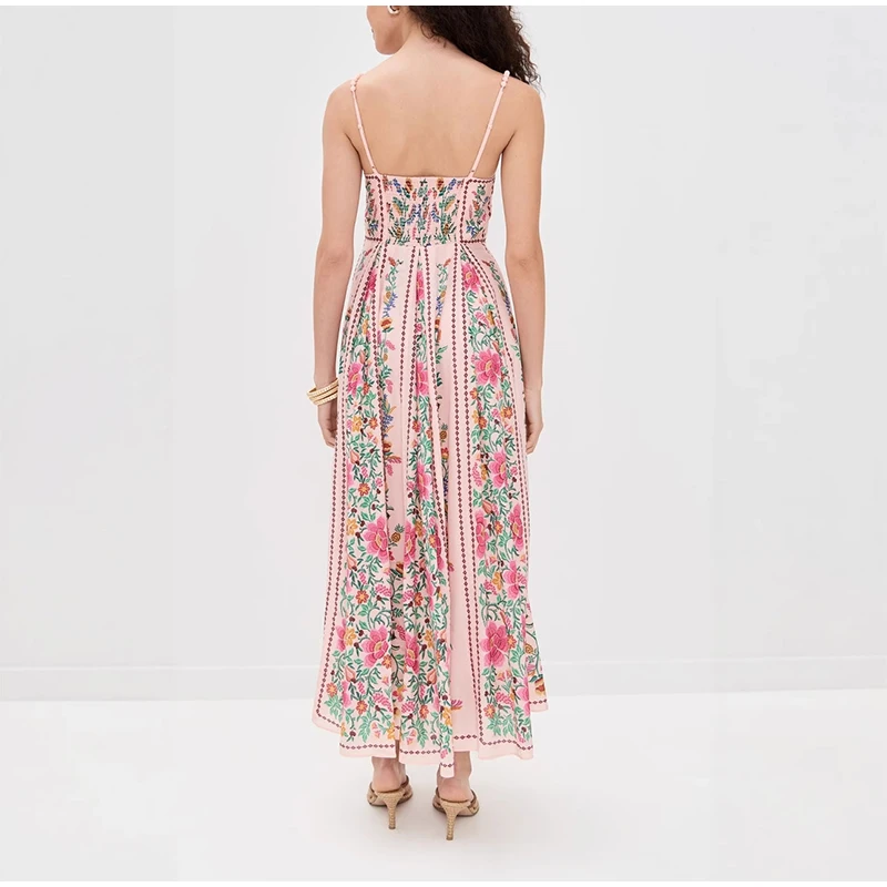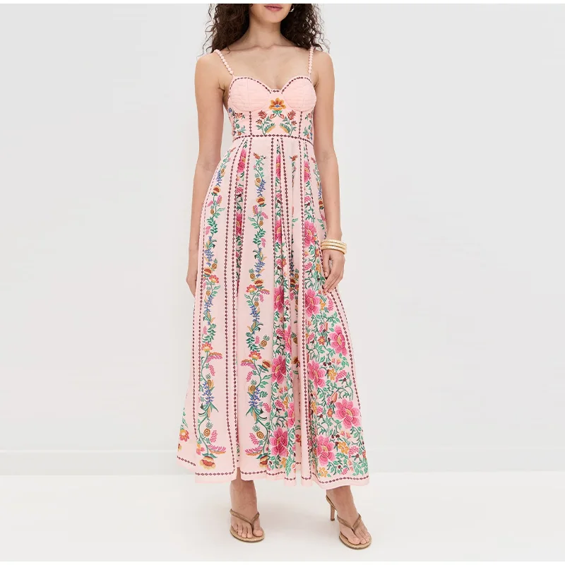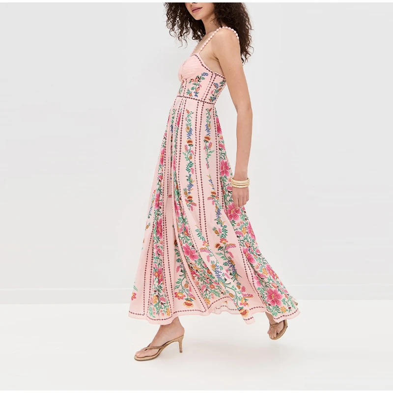 LIZAKOSHT - Sexy Printed Bead Sling Dress Women Fashion Sleeveless High Waist Pleated A-line Long Dresses 2025 Lady Summer Chic Party Robes