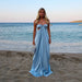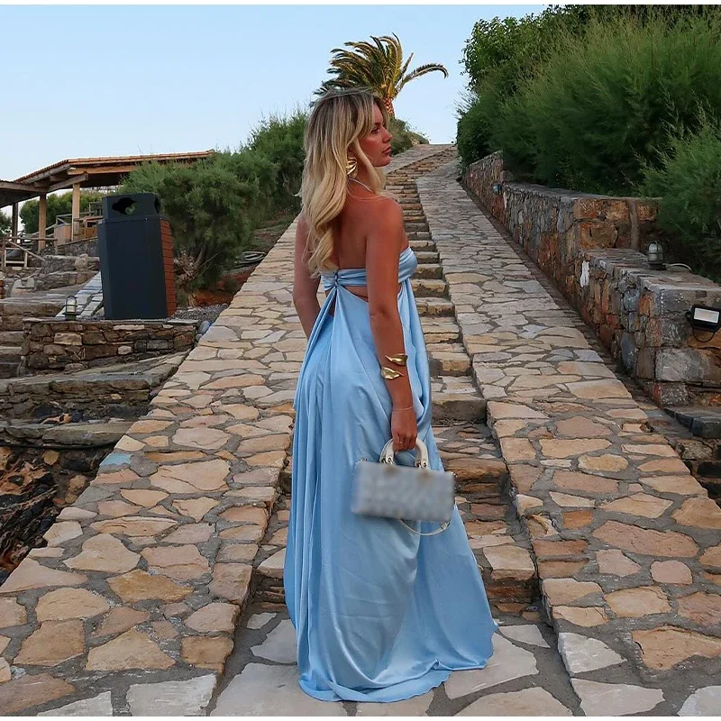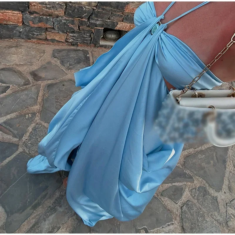 LIZAKOSHT  -  Sexy Satin Backless Halter Long Dress Women Sleeveless High Slit Pleat A-line Dresses Female 2025 Summer Holiday Beach Robes