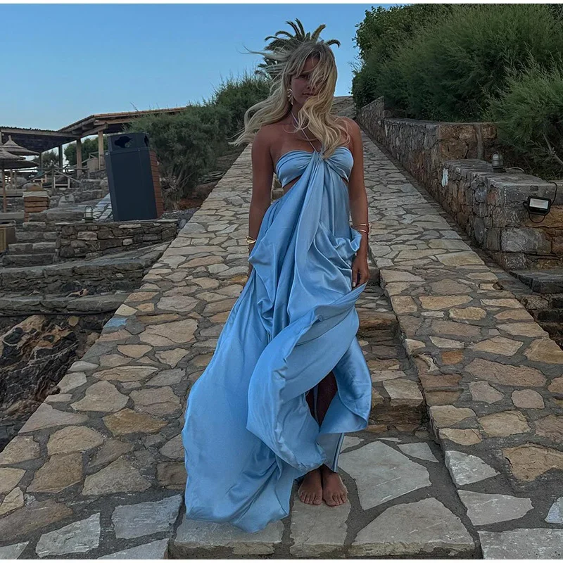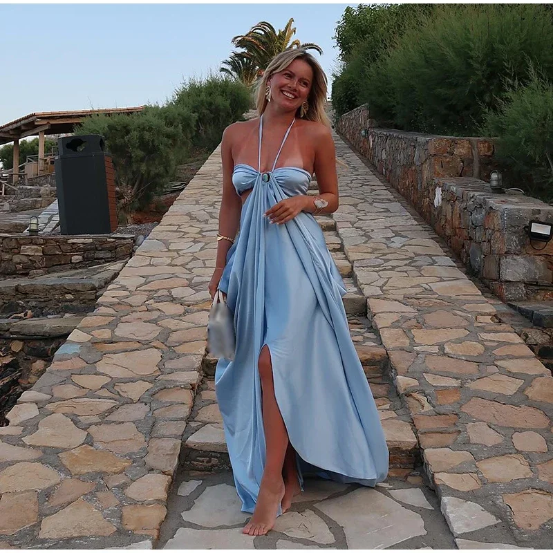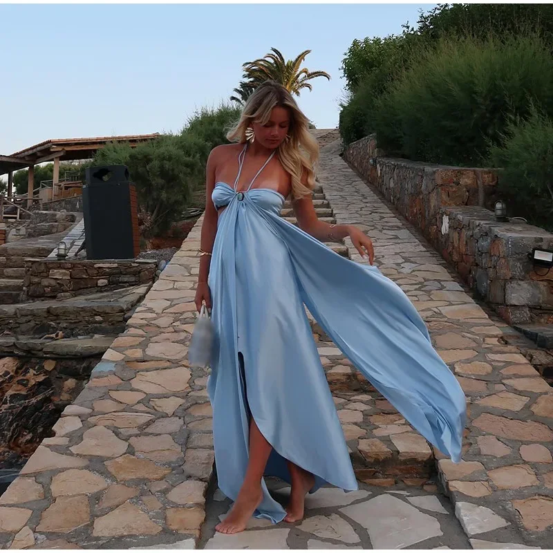 LIZAKOSHT - Sexy Satin Backless Halter Long Dress Women Sleeveless High Slit Pleat A-line Dresses Female 2025 Summer Holiday Beach Robes