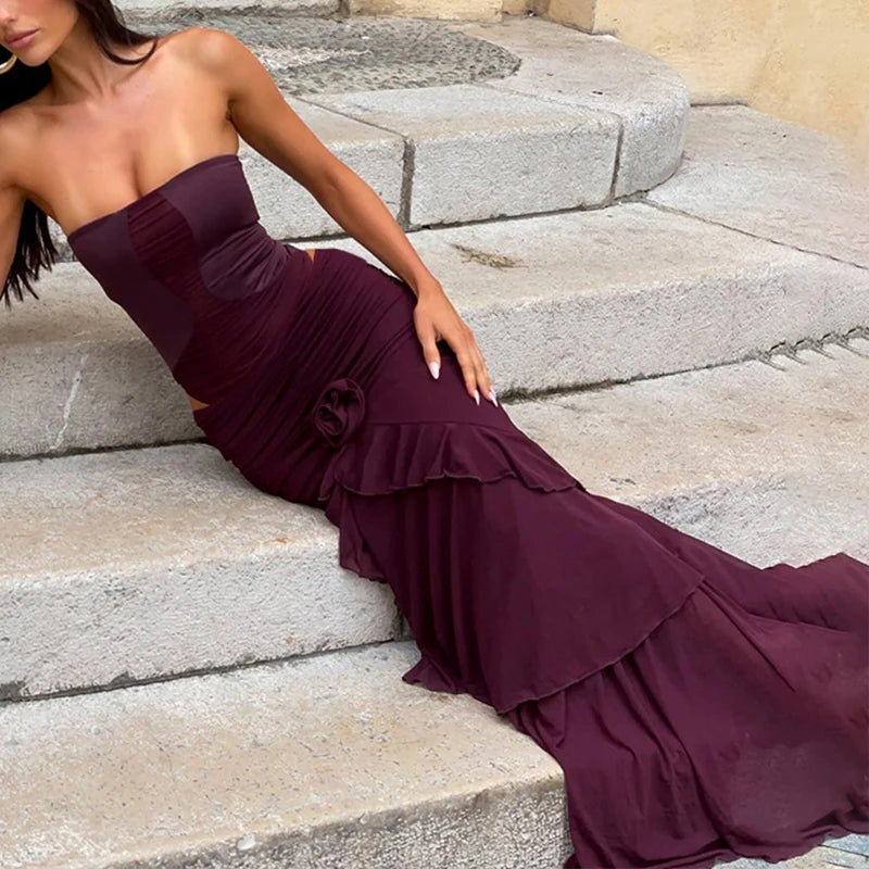 LIZAKOSHT  -  Sexy Strapless Mesh Patchwork Crop Top and Ruched Floral Appliques Long Skirts Solid Party Two Piece Club Beach Outfits 2025