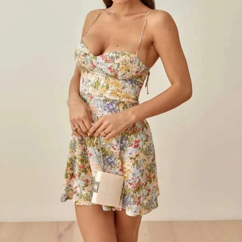 LIZAKOSHT - Sexy Women Lacing Up Sling Short Dresses Holiday Robe Retro French Yellow Green Floral Grass Print Spaghetti Strap Dress