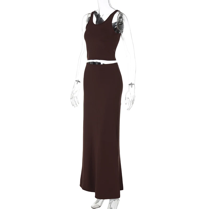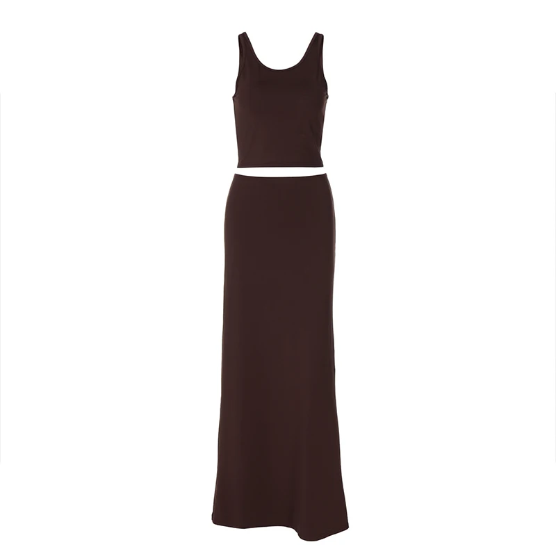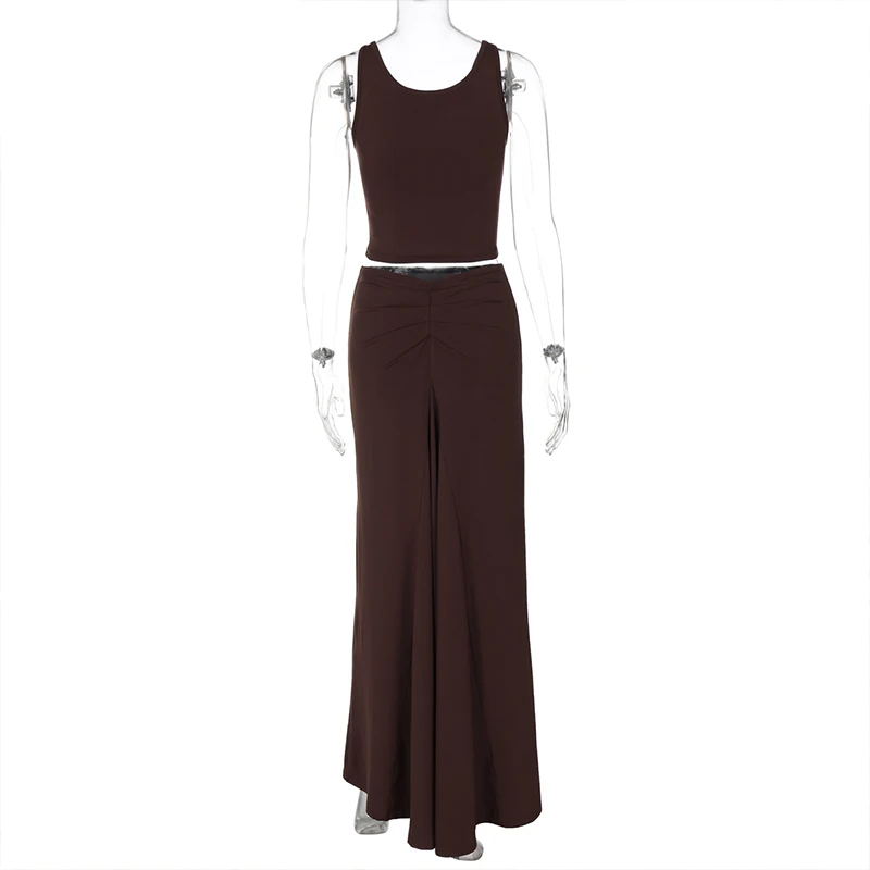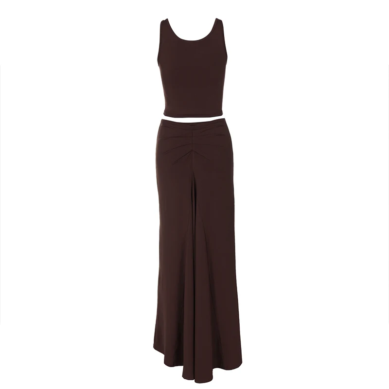 LIZAKOSHT  -  Simple Sexy Solid Color U Neck Camisole Tank Tops+Tight Ruched Long Half Skirts Women Fashion Street Style Two-piece Outfit