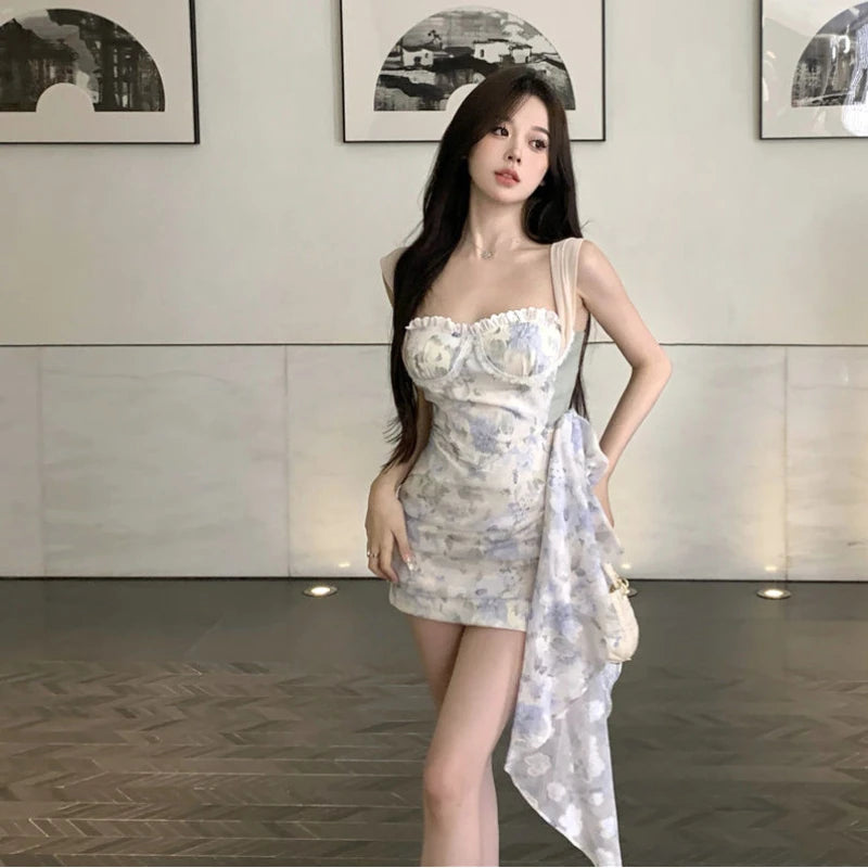 LIZAKOSHT - Sleeveless Dress with Sweet Temperament and Irregular Streamers with Pleated Floral Buttocks