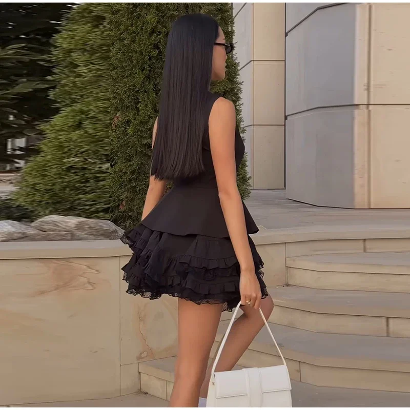LIZAKOSHT  -  Sleeveless Solid Women Tank Set A Line Ruffles Cake Hem Women Skirt Sets 2025 Fashion Summer Single Breasted Lady Vest Suit