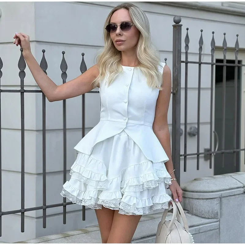 LIZAKOSHT - Sleeveless Solid Women Tank Set A Line Ruffles Cake Hem Women Skirt Sets 2025 Fashion Summer Single Breasted Lady Vest Suit