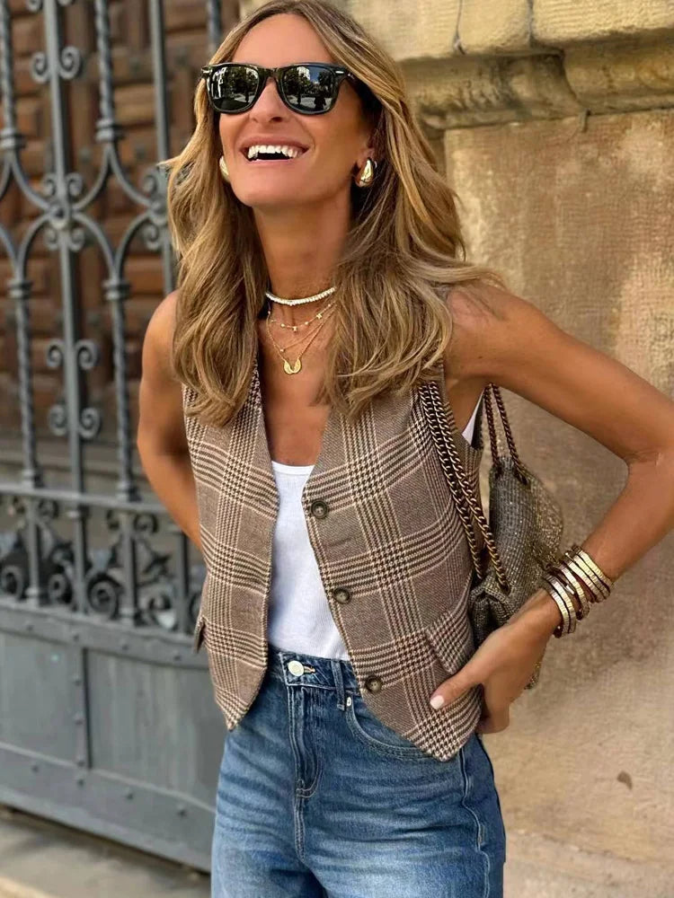 LIZAKOSHT  -  Sleeveless Vest for Women Female Chic V-Neck Single-breasted Summer Vests Tops Ladies Casual Houndstooth Waistcoat New