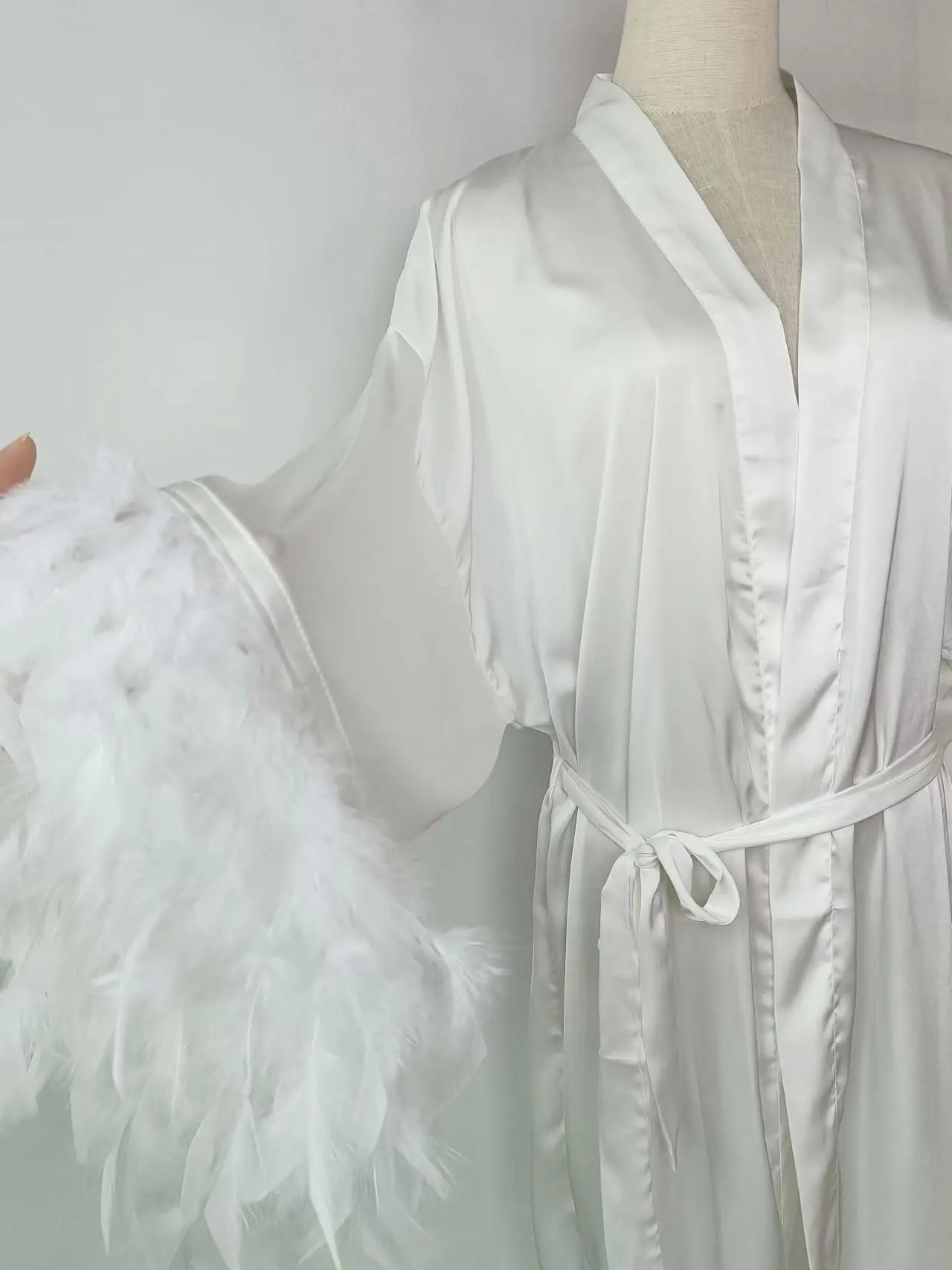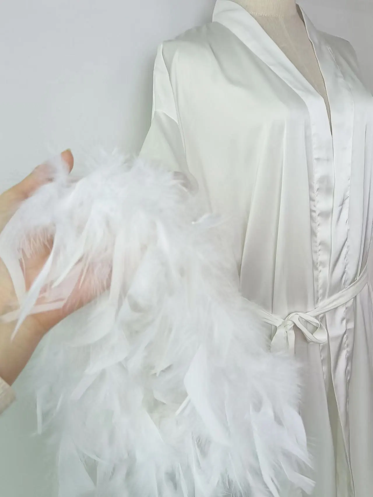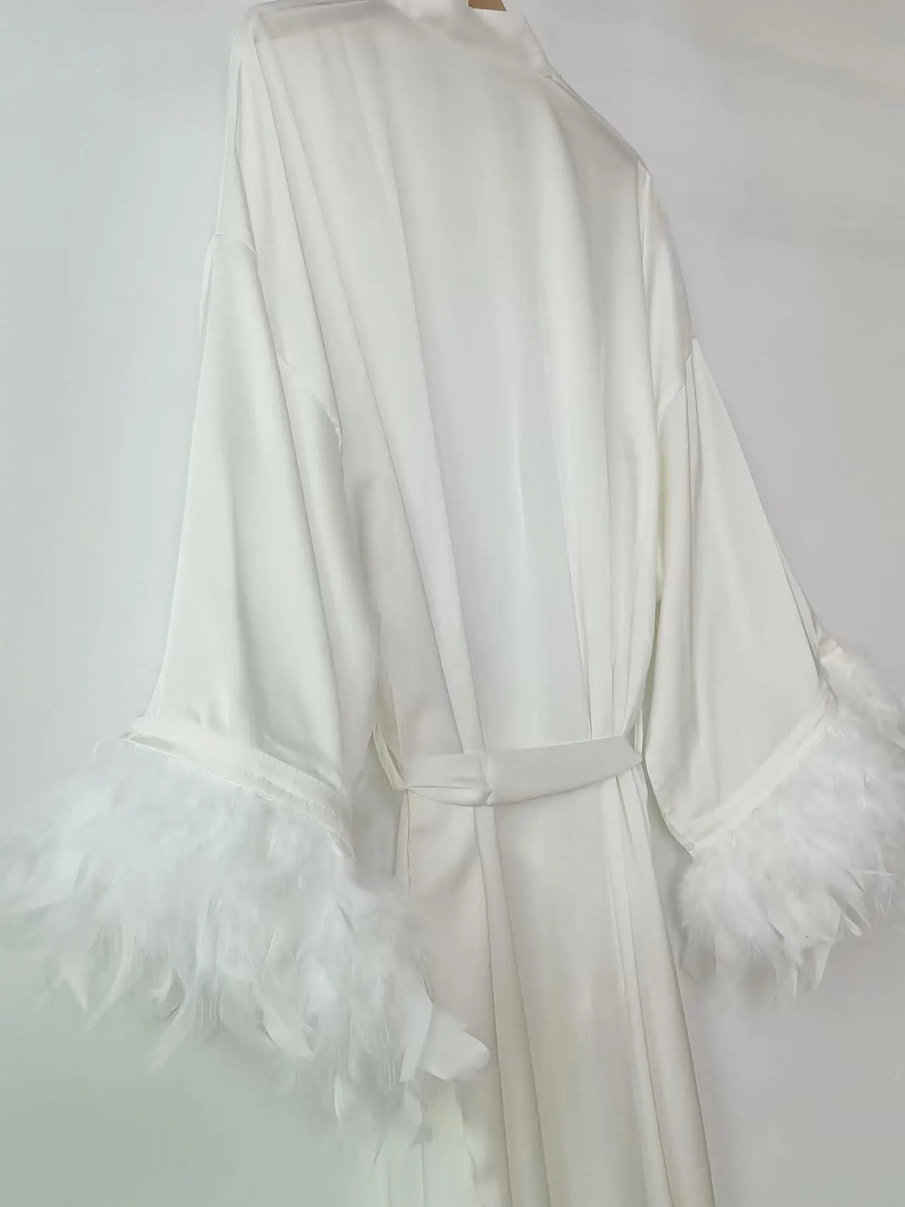 LIZAKOSHT - Soft White Wedding Robe Bridal Feather Sleeves Gown Bride Silk Boudoir Robes Satin Bridal Lingerie Long Bathrobe Handmade Kimono