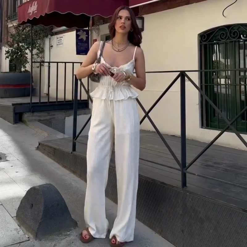 LIZAKOSHT  -  Solid Color Ruched Bandage V-neck Spaghetti Strap Tops and Wide Leg Long Pant Y2K Summer Casual New Women 2 Piece Sets