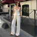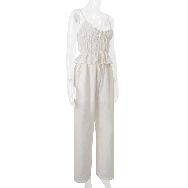 LIZAKOSHT - Solid Color Ruched Bandage V-neck Spaghetti Strap Tops and Wide Leg Long Pant Y2K Summer Casual New Women 2 Piece Sets