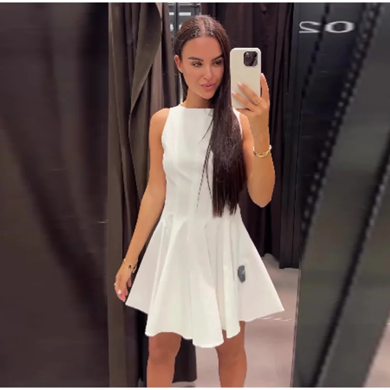 LIZAKOSHT - Solid Pleated Mini Tank Dress Women Elegant Slash Neck Sleeveless Lady Dresses New Summer Fashion Commuting OL Short Robes