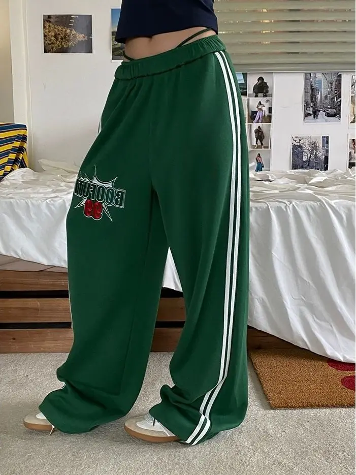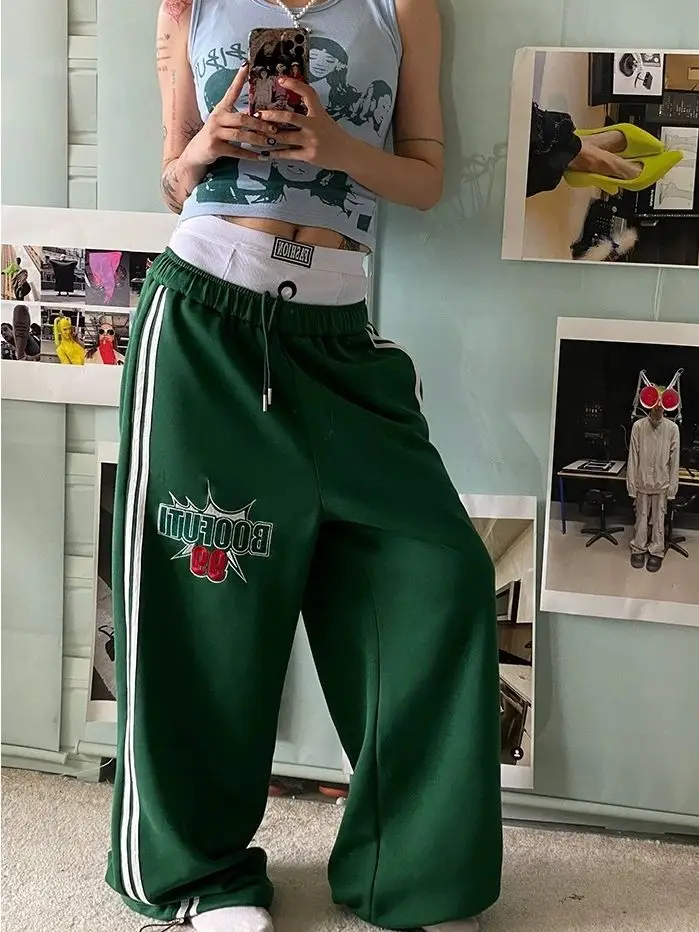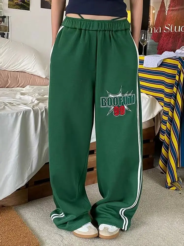 LIZAKOSHT - Sports Pants Two-Bar Letter Printing American Summer Women Green Loose Straight Mop The Floor Leisure Wide-Leg Pants Tide