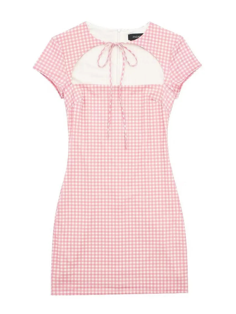 LIZAKOSHT  -  Spring/summer European and American Ladies' Short-sleeved Dresses with Small Plaid Pink Ribbons and Knotted Bows.