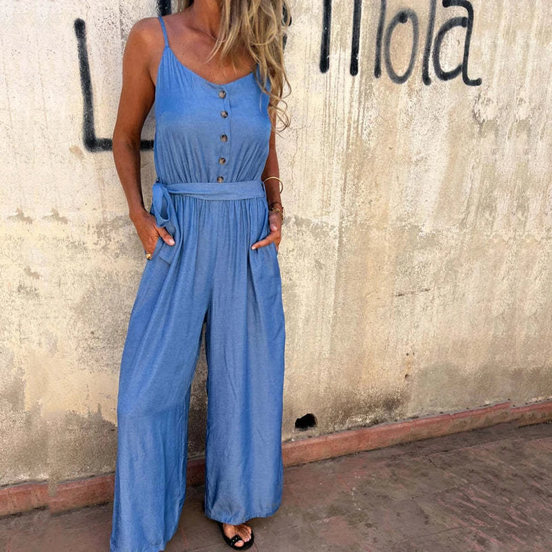 LIZAKOSHT - Spring Summer Sleeveless Boho Jumpsuits Women U Neck Button Pocket Sling Playsuit Summer Backless Wide Leg Pants Romper Overalls