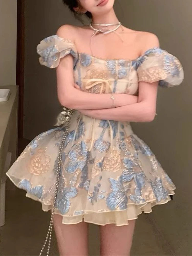 LIZAKOSHT - Square Neck Elegant Sweet New Dress Women Fairy Bow Party Mini Dress Female Short Sleeve Print Fashion Boho Beach Dress Summer