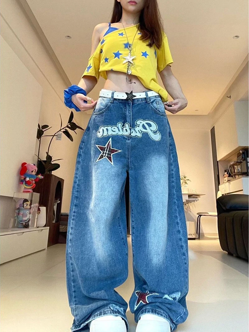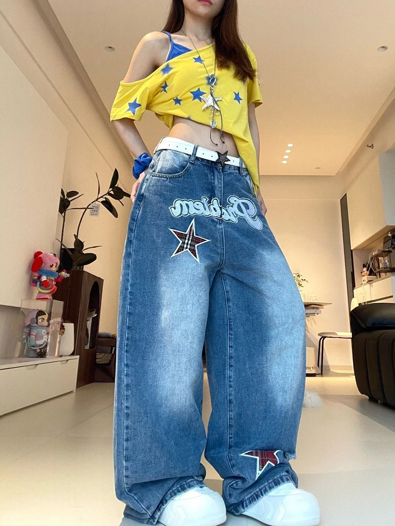 LIZAKOSHT - Streetwear Wide Leg Jeans Women Letter Star Print Vintage Harajuku Scimitar Trouser Loose Casual High Waist Patchwork Pants New