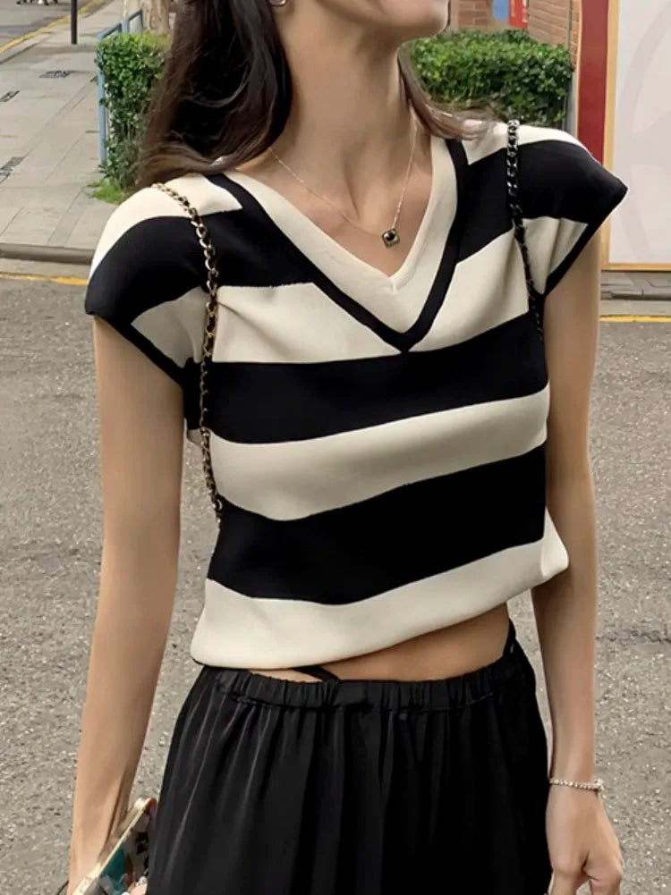 LIZAKOSHT - Striped Crop Top y2k Aesthetic V-neck Short Sleeve T Shirt Women Sweats Casual Streetwear