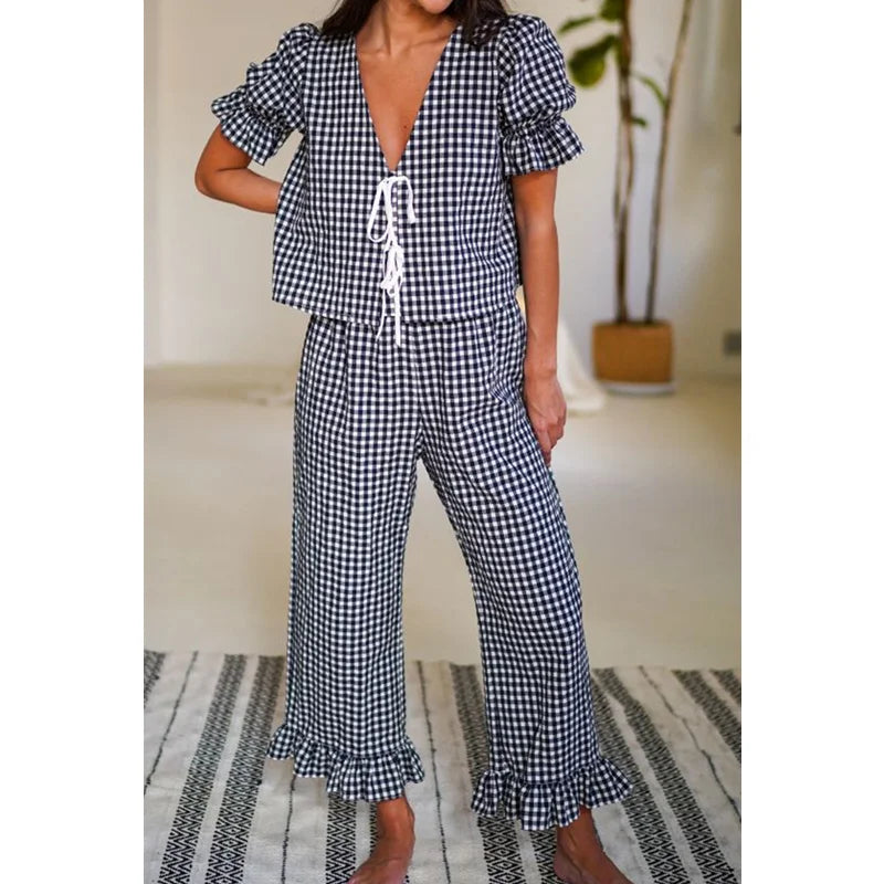 LIZAKOSHT - Summer 2 Piece Set for Women Plaid Print V Neck Tie Front Short Sleeve Shirt Top and Wide Leg Pants Streetwear