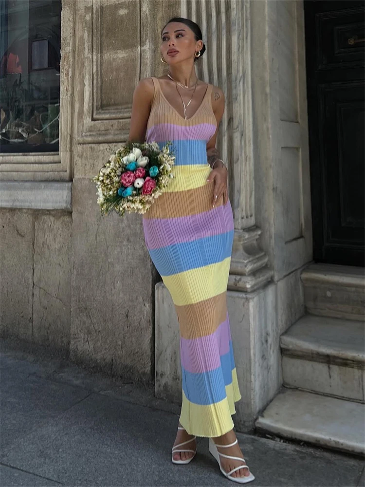 LIZAKOSHT - Summer Fashion Contrast Striped Knitted Long Dress Vacation Casual For Women Sexy V-Neck Sleeveless Backless Dress