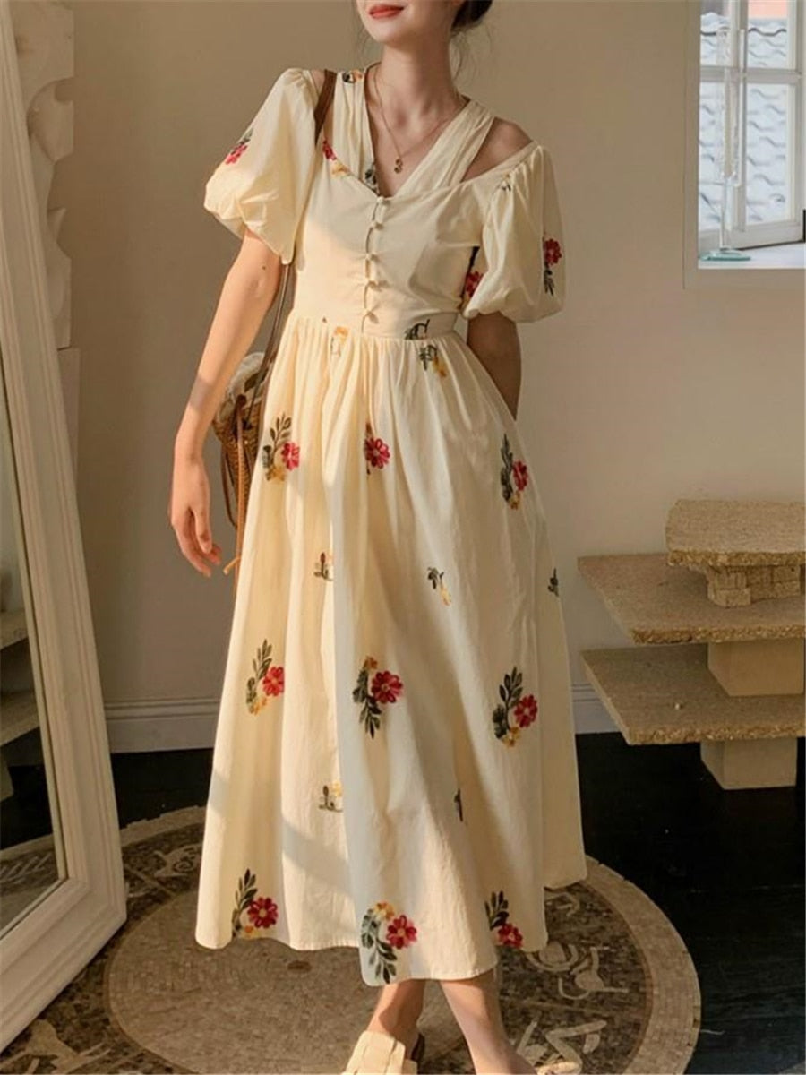Lizakosht Summer Floral Print Midi Dress Korean Style Women Casual Puff Sleeve Single Breasted Vestidos Ladies 2023 New Clothing
