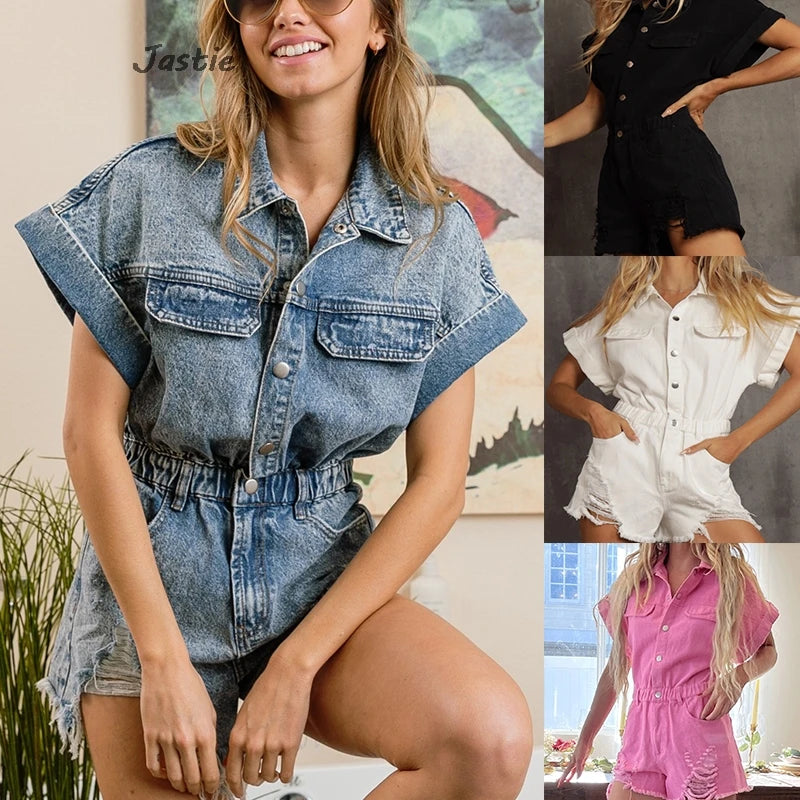 LIZAKOSHT - Summer New Fashion Women Playsuit Elastic Waist Short Sleeve Denim Shorts Ripped Jeans Distressed Rompers