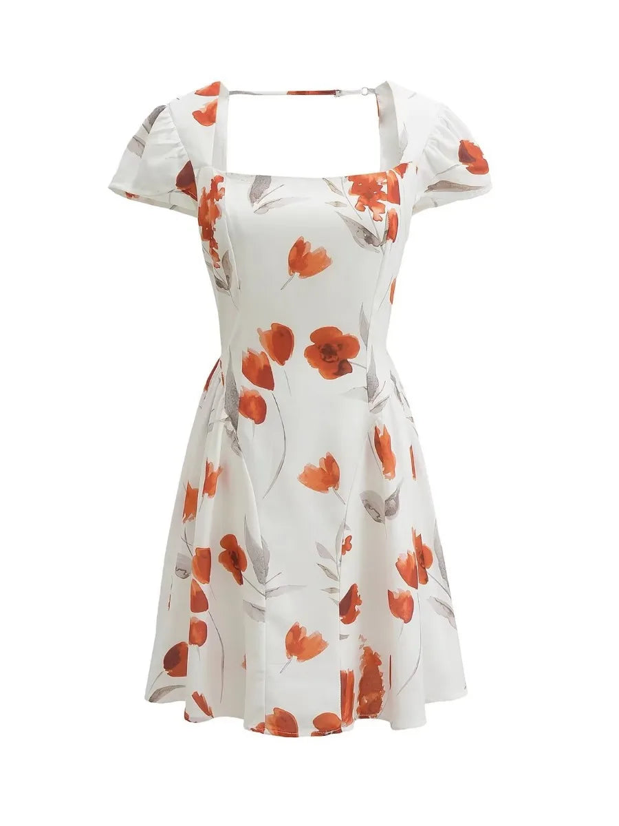 LIZAKOSHT - Summer New Flower Printed Square Collar High Waist Slim Dress Short Skirt