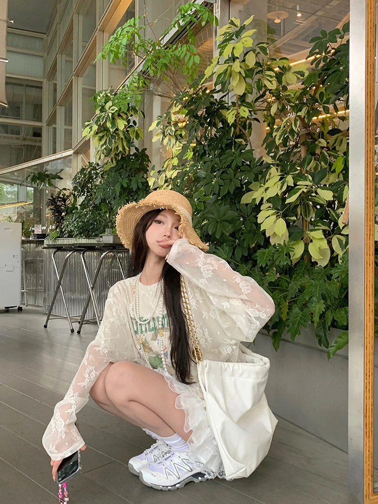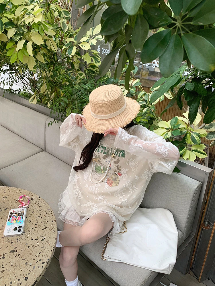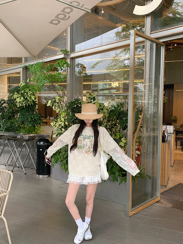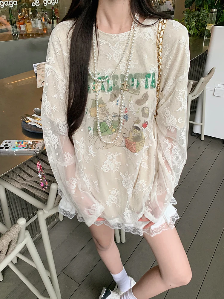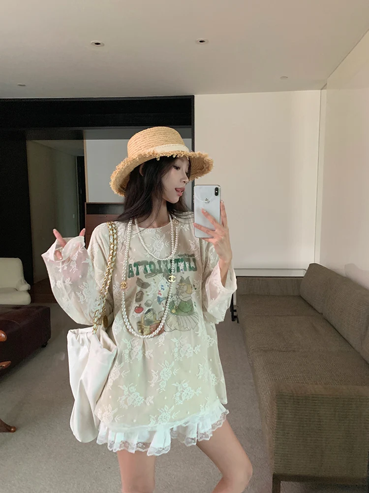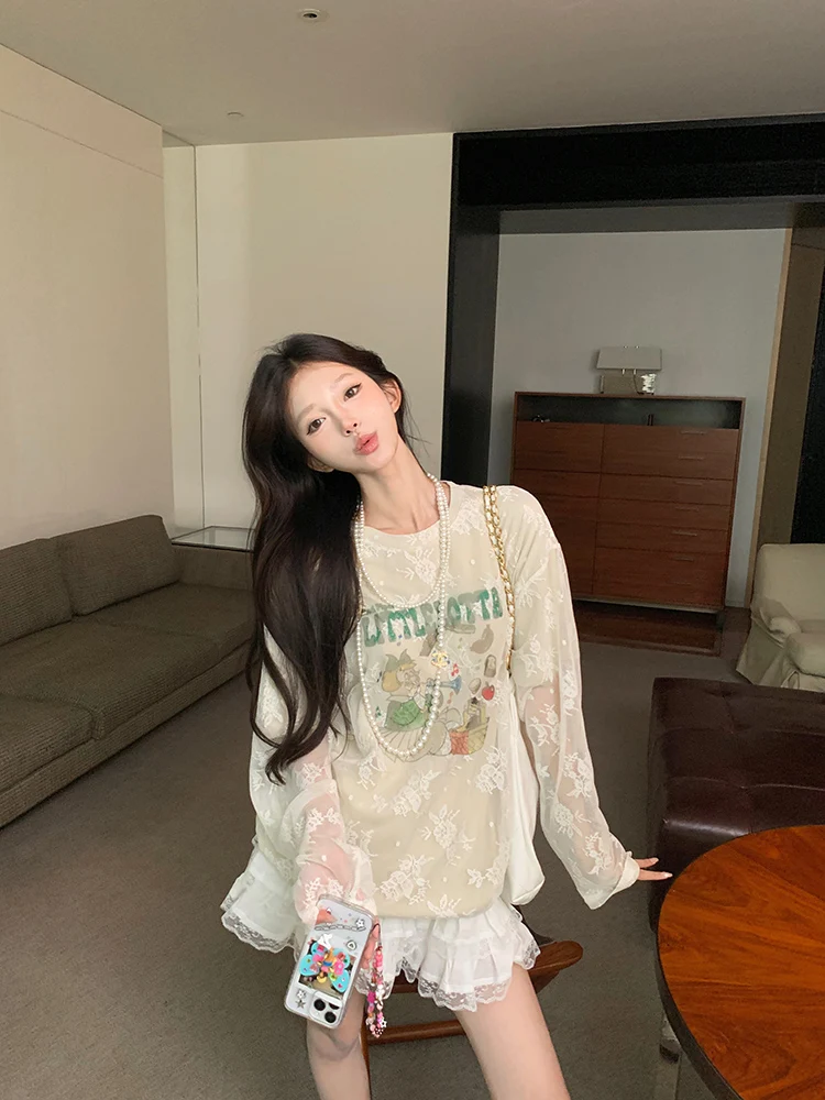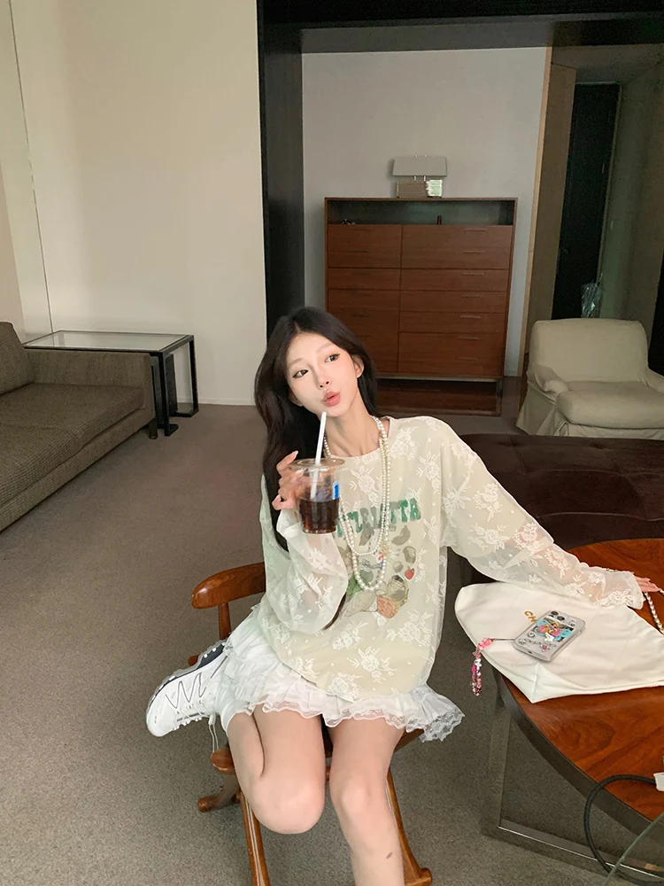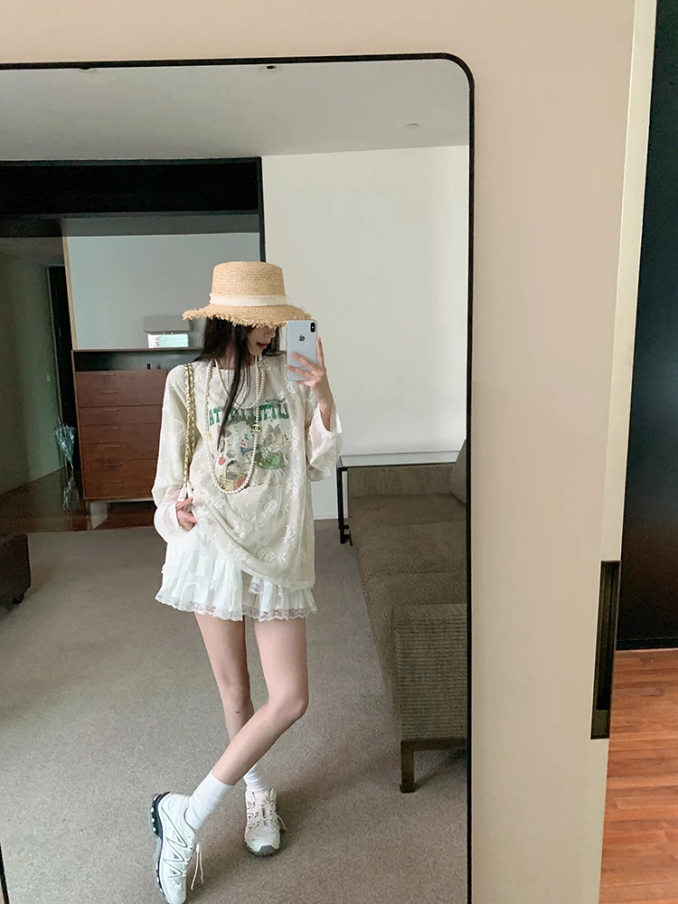 LIZAKOSHT - Summer New Streetwear Cartoon Printed Loose Casual Mesh Long Sleeve T-Shirt Women + Pleated White Cake Skirt Two-piece Suit