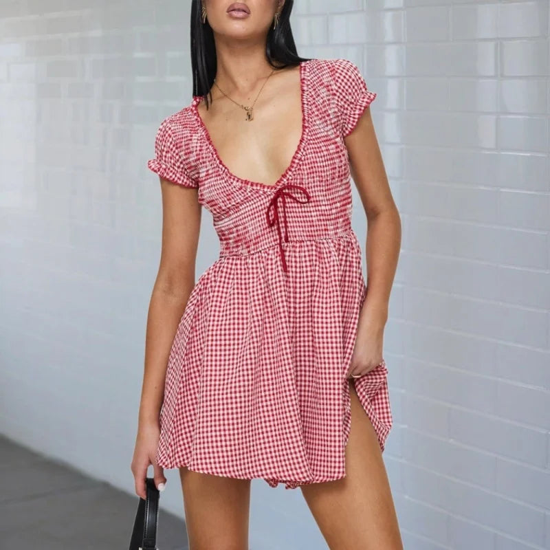 LIZAKOSHT - Summer Playsuit Women y2k Clothes Plaid Print Deep V Neck Short Sleeve High Waist Short Jumpsuit 2000s Streetwear