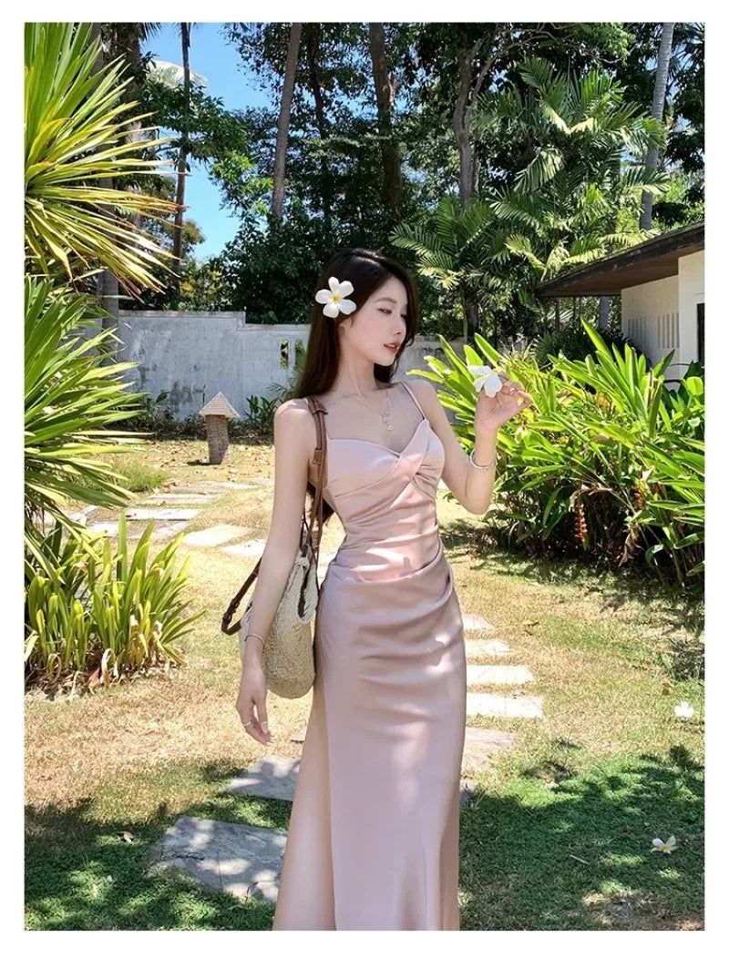 LIZAKOSHT - Summer Sexy Backless Satin Straps Midi Dresses for Women 2024 Elegant Party Sleeveless Female Clothing Beach Holiday Pink New