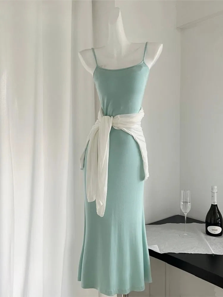 LIZAKOSHT - Summer Spaghetti Straps Slim Midi Dress With White T-shirt Women Casual Solid Simple Party Vestidos Holiday Beach Outfits