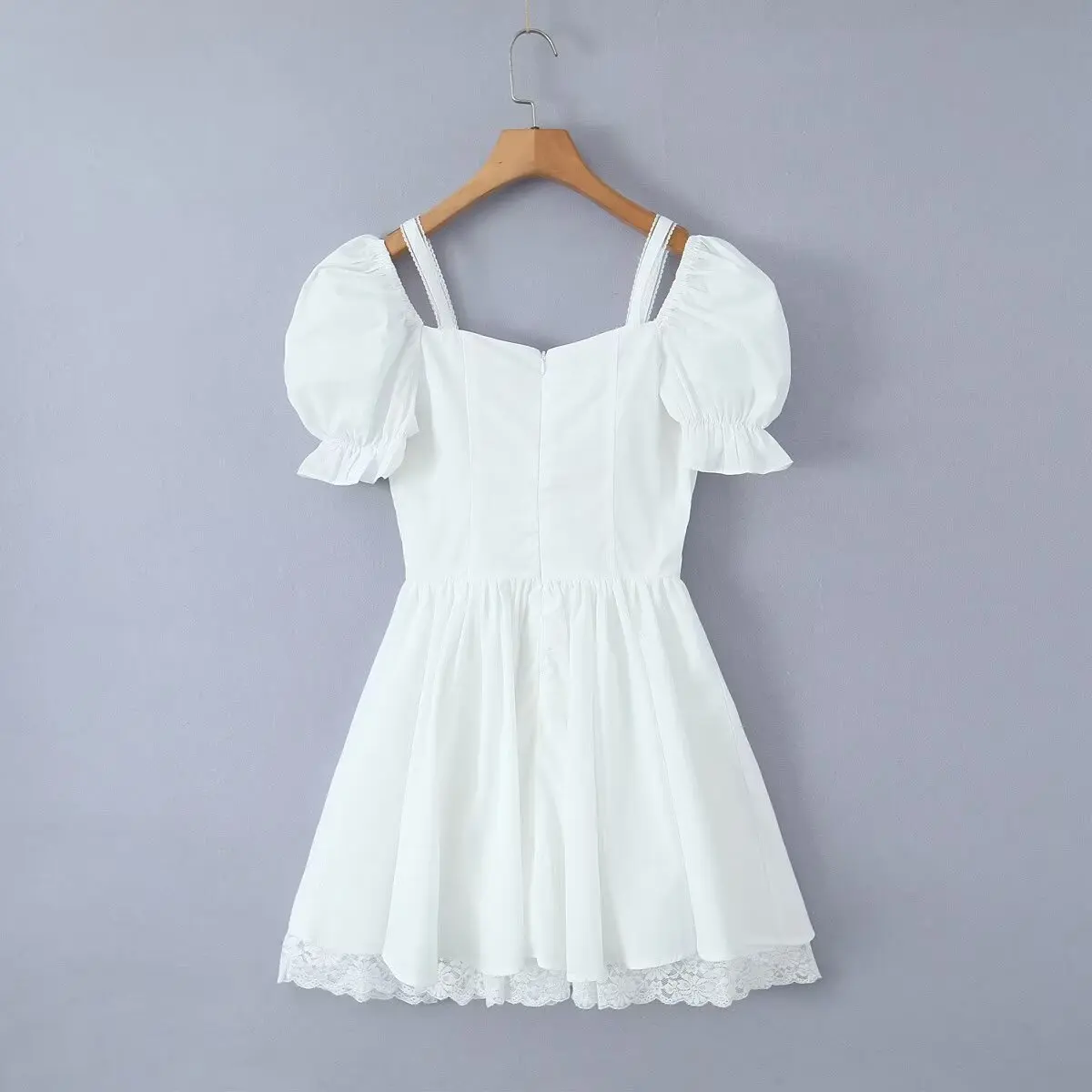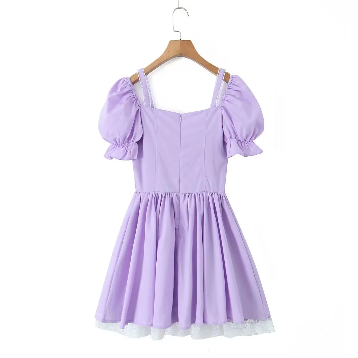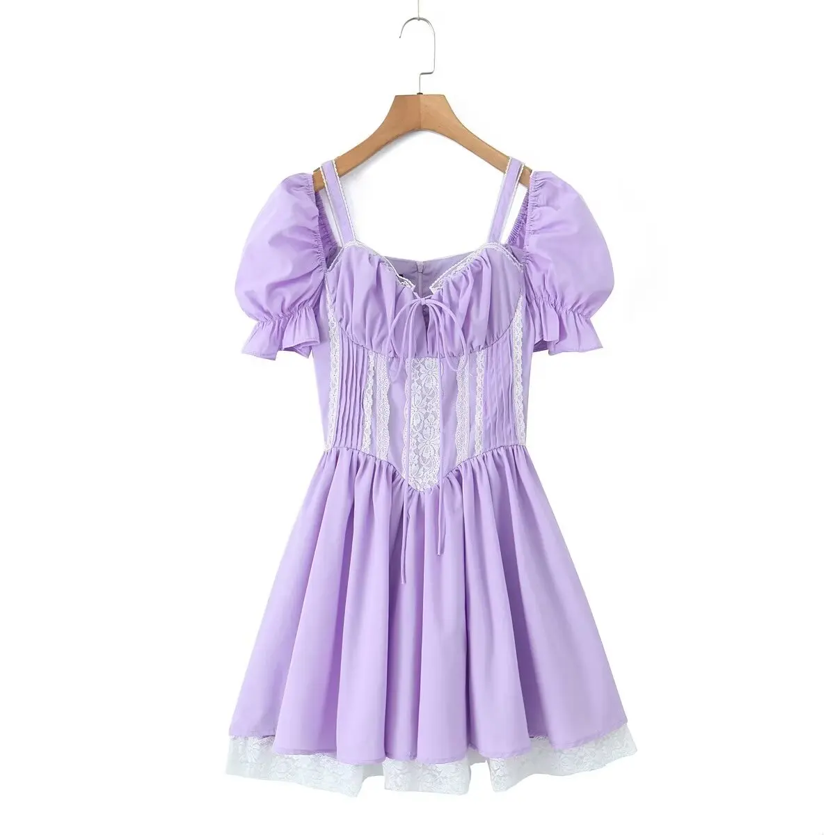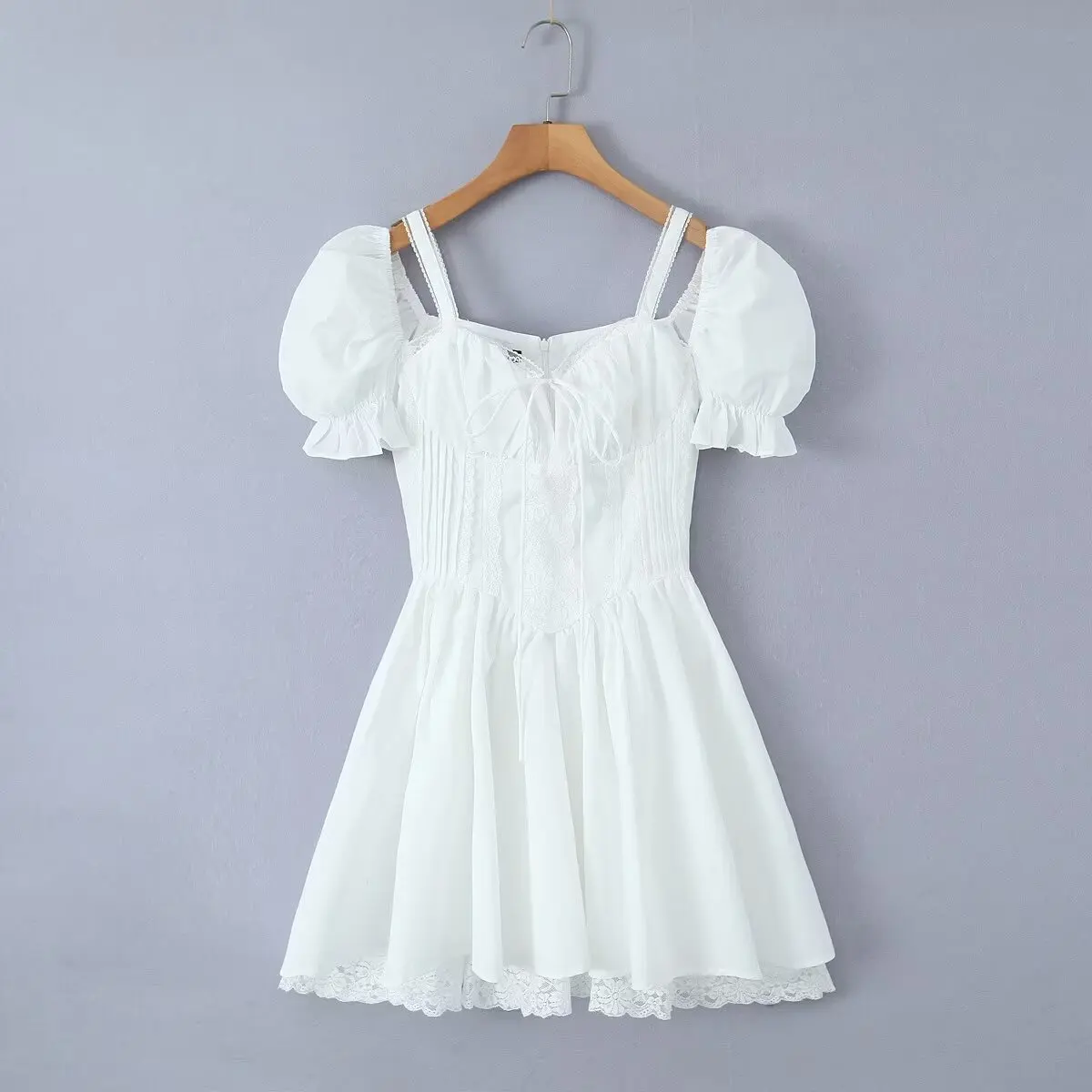 LIZAKOSHT - Summer Sweet Princess Mini Dress Women Puff Sleeve Spliced Lace Slim Waist Ruffle Hem Cake Party Robe Fairy Vestidos