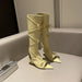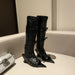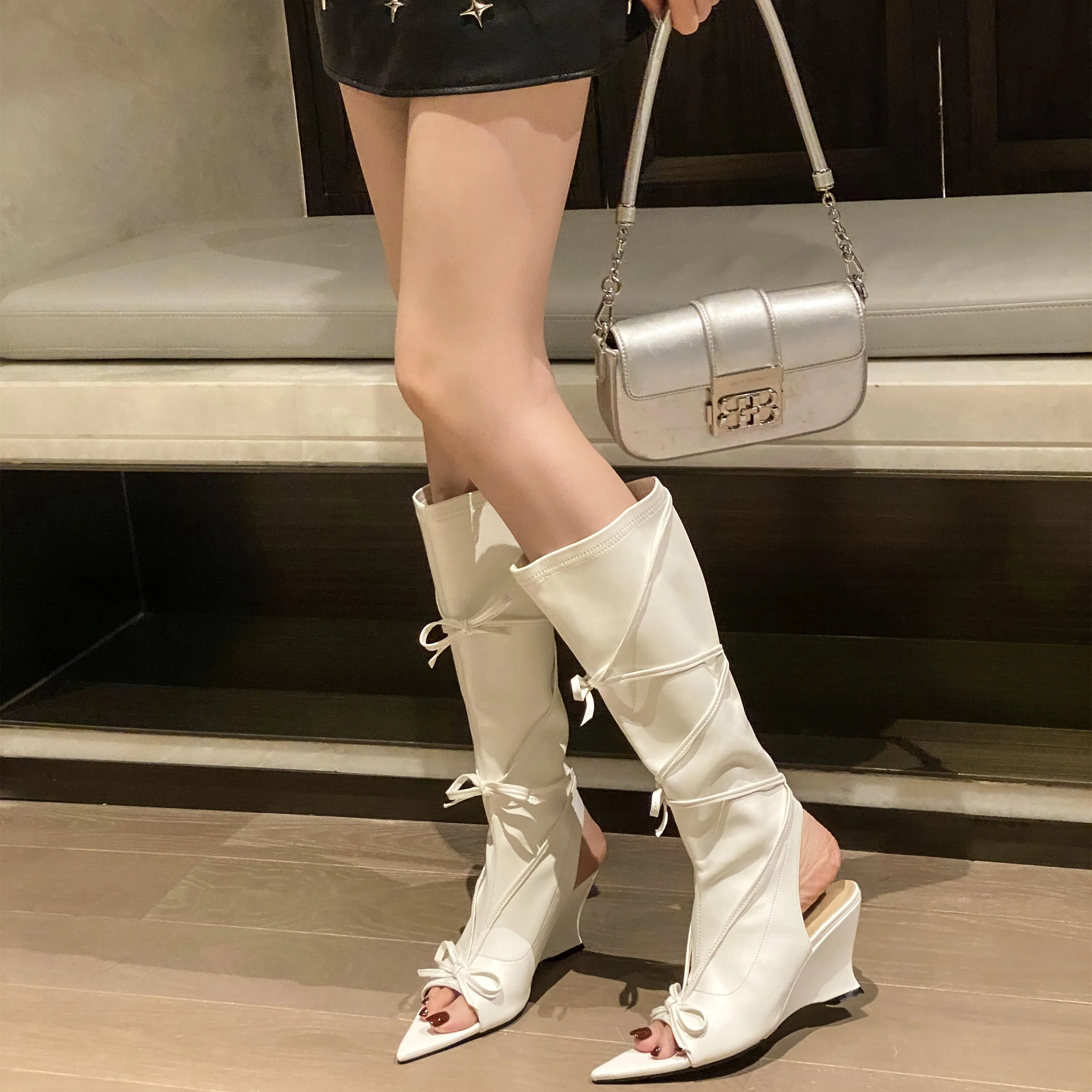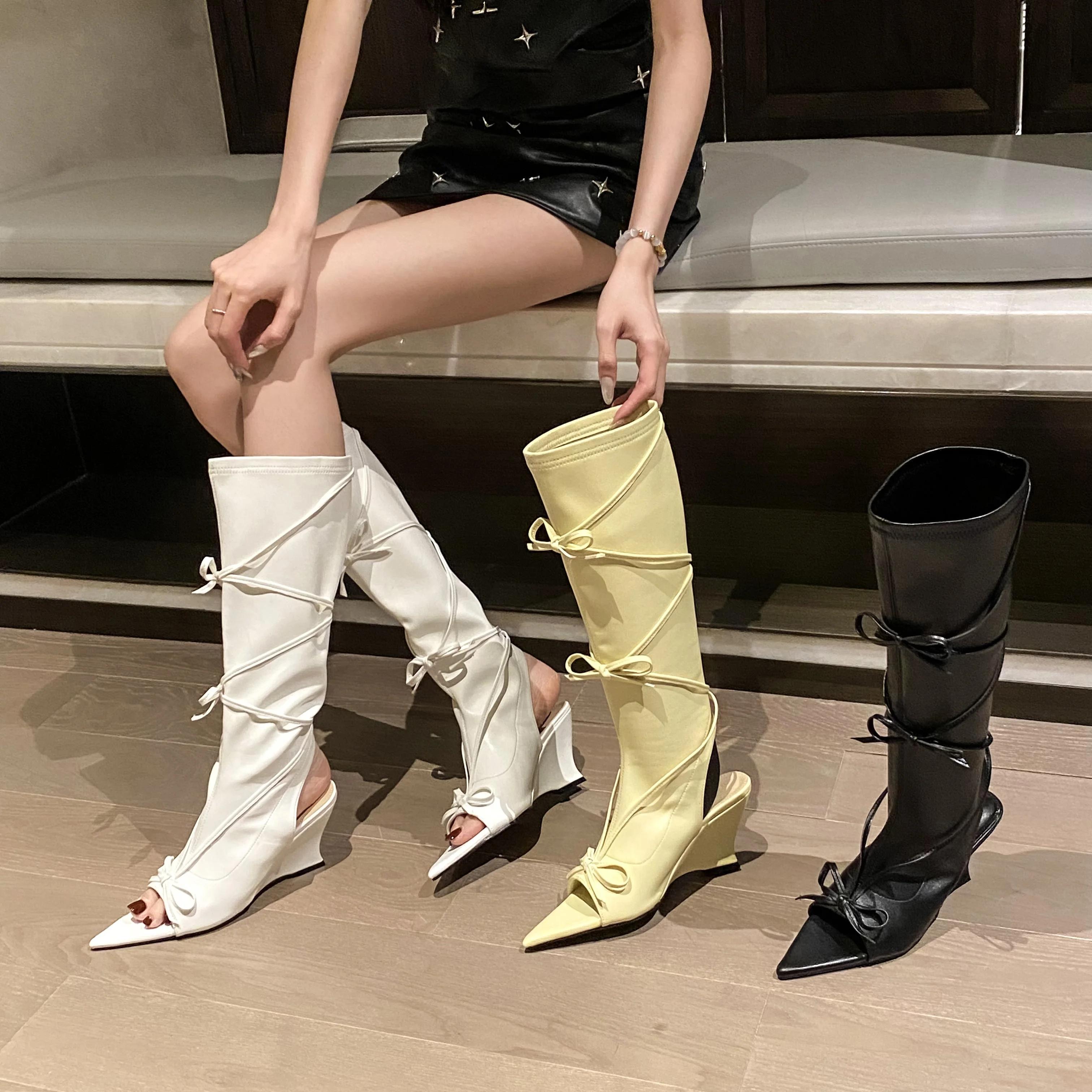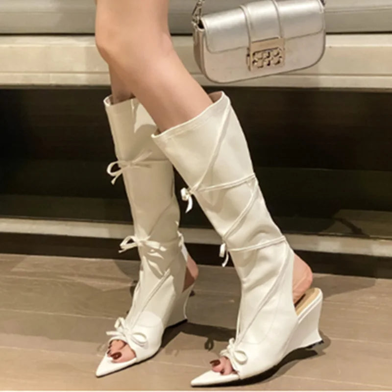 LIZAKOSHT - Summer Tall Sandals For Women Fashion Pointed Toe Low Heel Female Knee High Boots Butterfly-Knot Solid Color Wedges Shoes Ladies