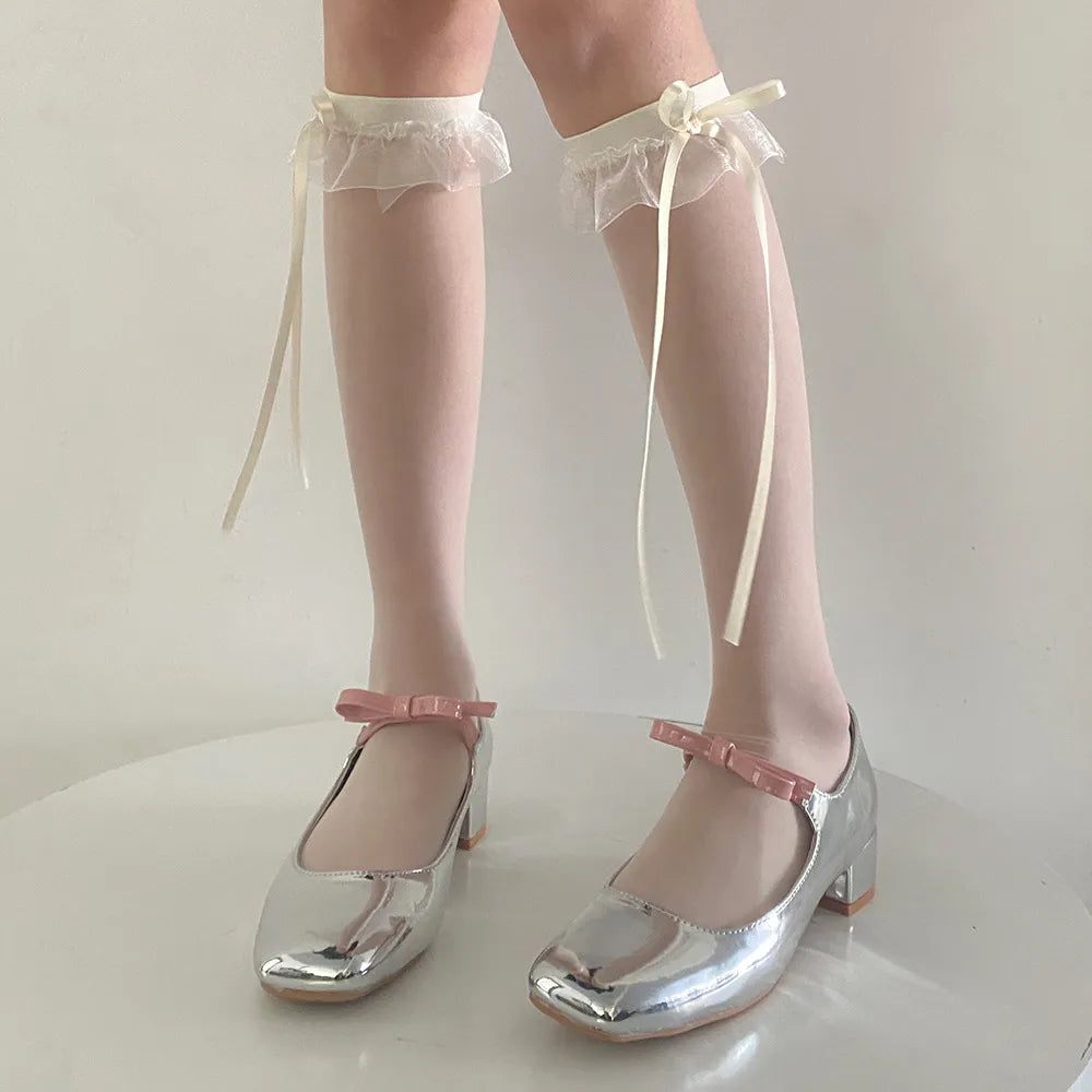 LIZAKOSHT Summer Ultra-thin Transparent Nylon Long Socks Stockings JK Lolita Lace Ruffles Knee Socks Japanese Style Ribbon Bow Stockings