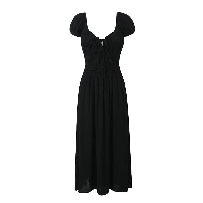LIZAKOSHT - Summer Women Sexy Backless Long Dress Vintage Puff Sleeve Elastic Waist Female Holiday Party Robe Black White