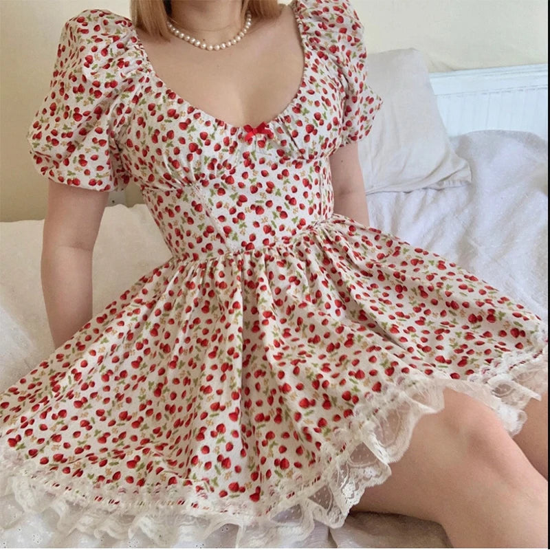 LIZAKOSHT - Summer Women Strawberry Print Sweet Dress Vintage Puff Sleeve V Neck Ladies Holiday Elegant Dress Short Robe Beautiful Clothing