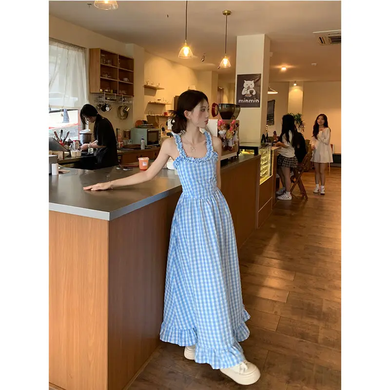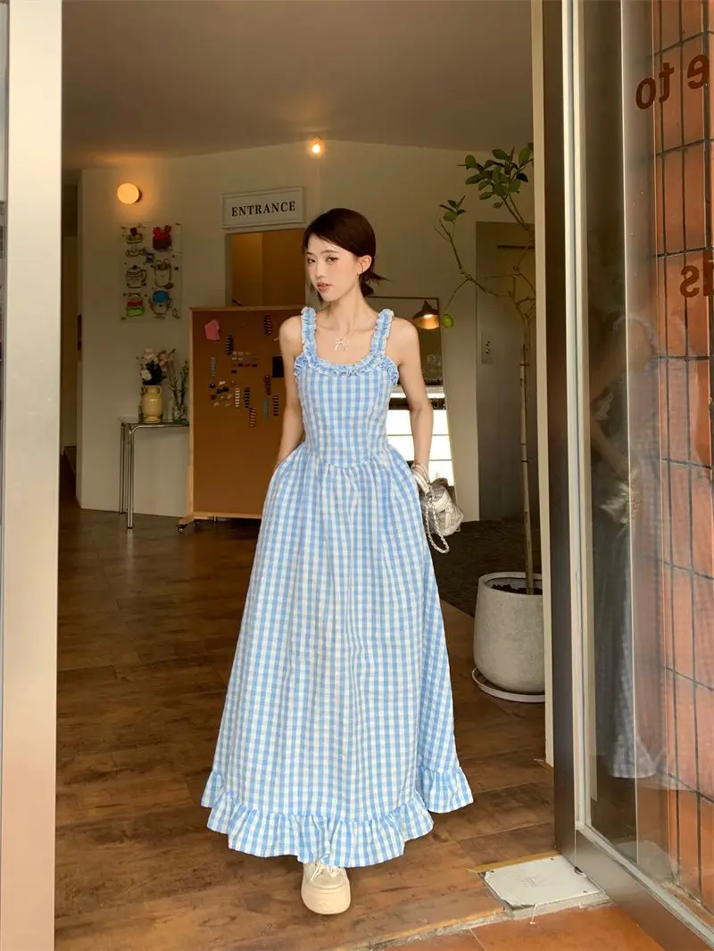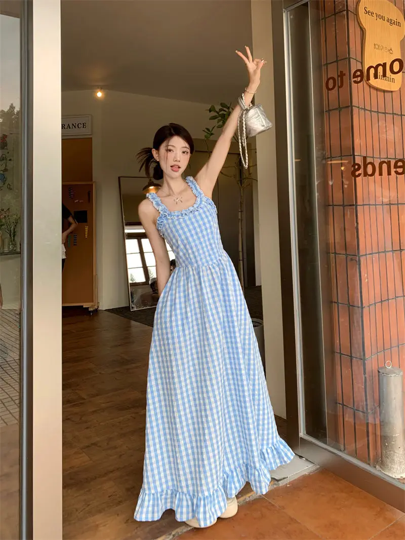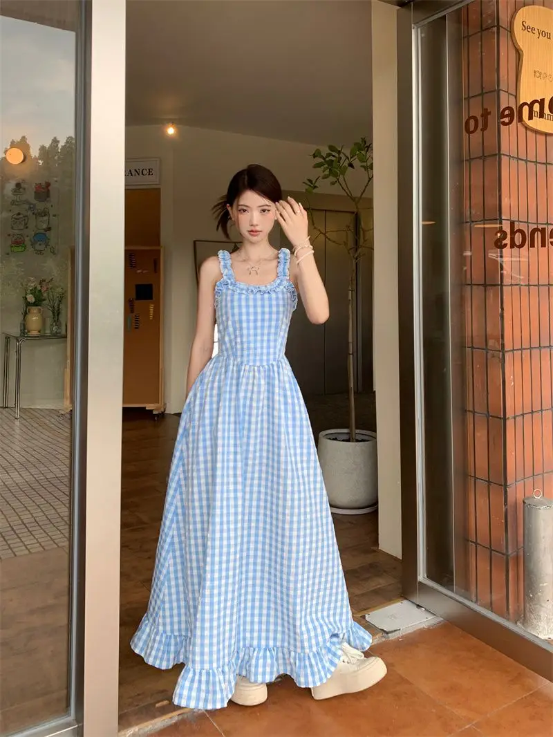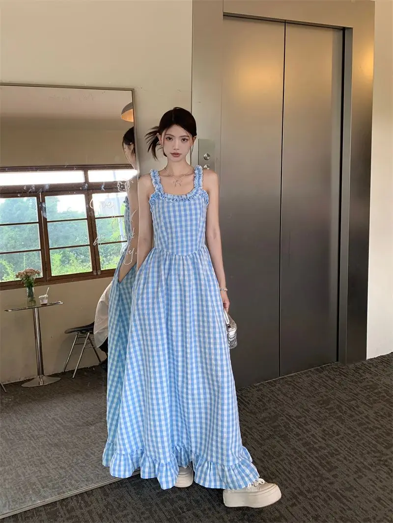 LIZAKOSHT - Suspender Long Skirt Fungus Edge Plaid New Sea Salt Ice Cream Women'S Fresh Summer Sweet Retro Long Dress