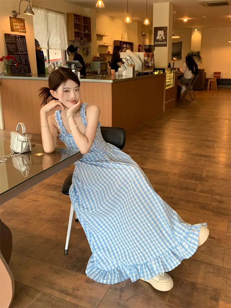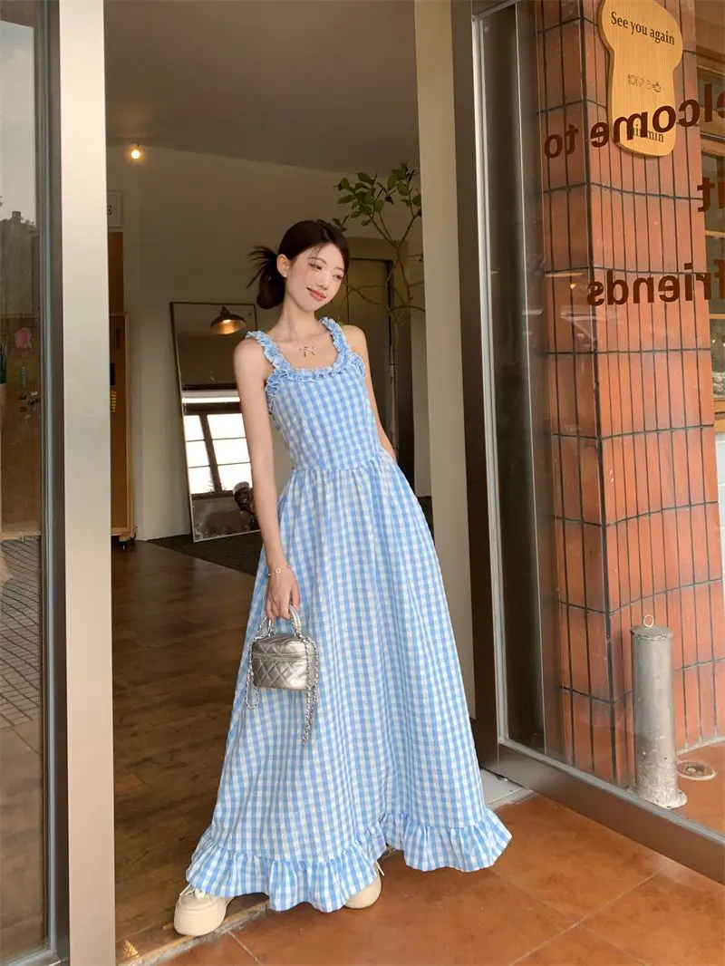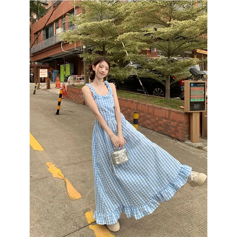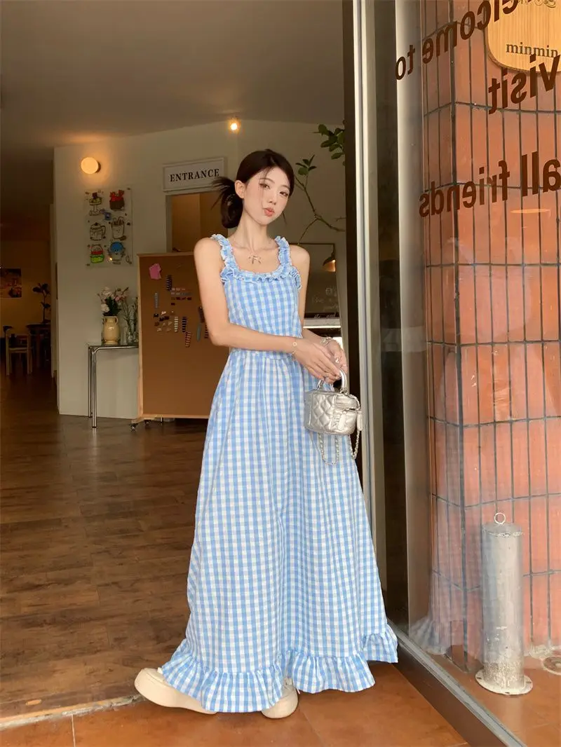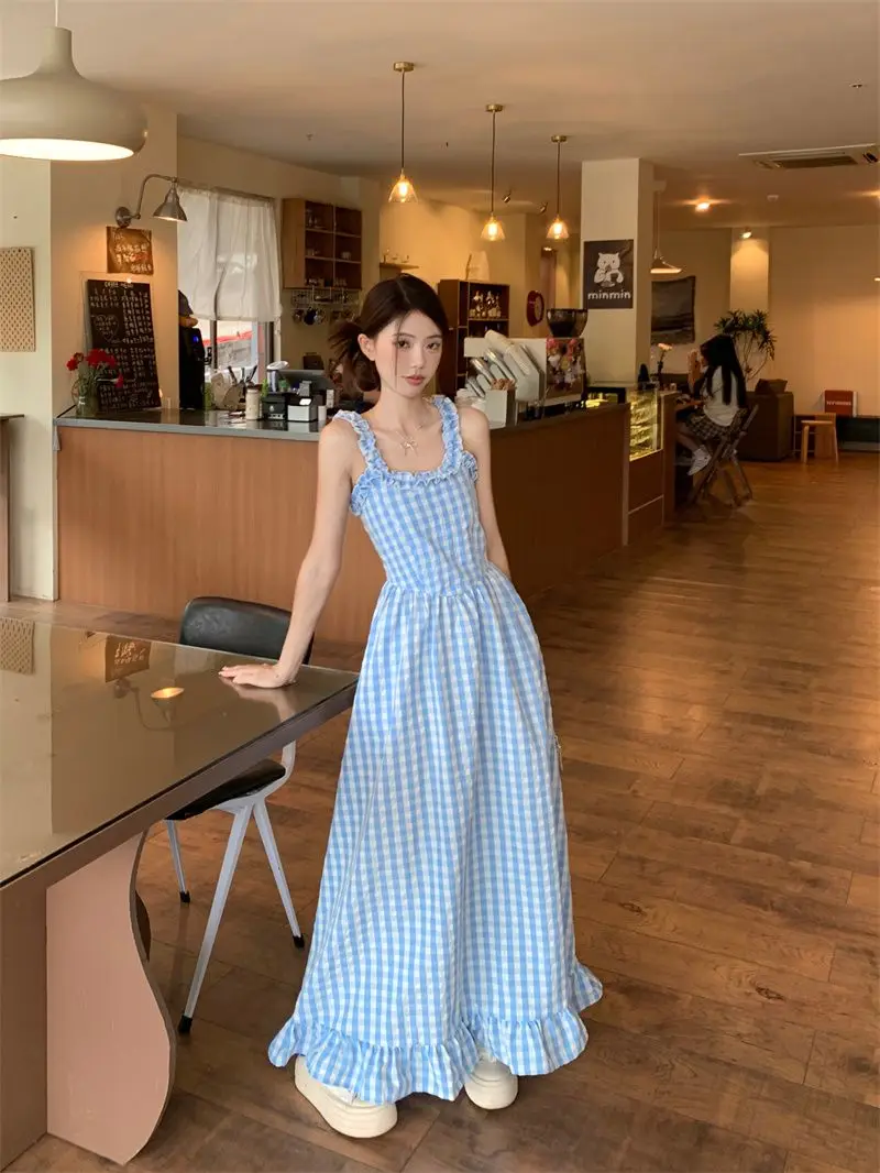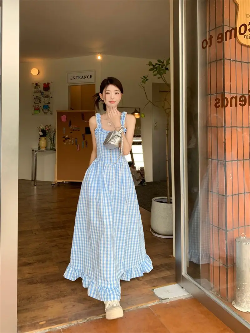 LIZAKOSHT - Suspender Long Skirt Fungus Edge Plaid New Sea Salt Ice Cream Women'S Fresh Summer Sweet Retro Long Dress