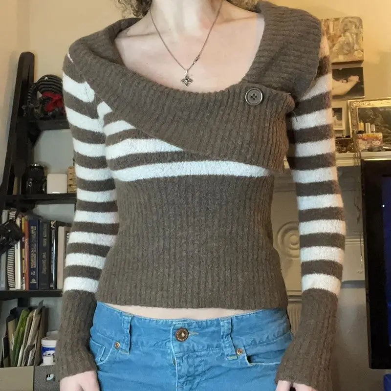 LIZAKOSHT - Sweater Contrast Striped Diagonal Collar American Retro Female Slim Slim Hot Girl Sweater Short Coat Tide