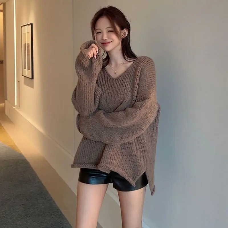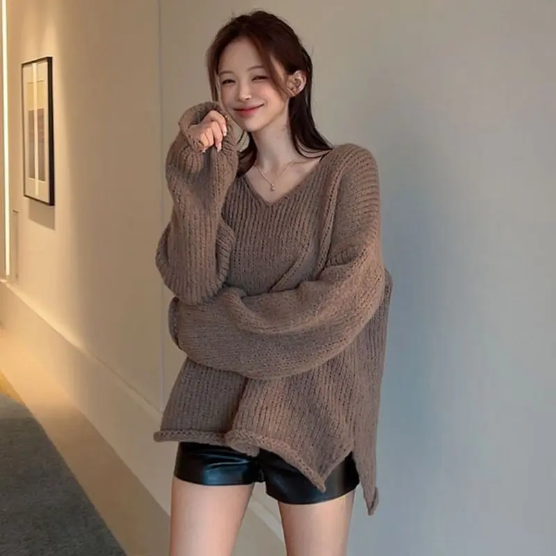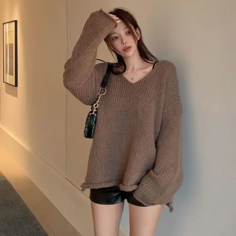 LIZAKOSHT - Sweaters Brown V-Neck Slit Autumn Retro Knitted Jumper Tops Y2K Harajuku Casual Women Basic Loose Pullover Korean Style