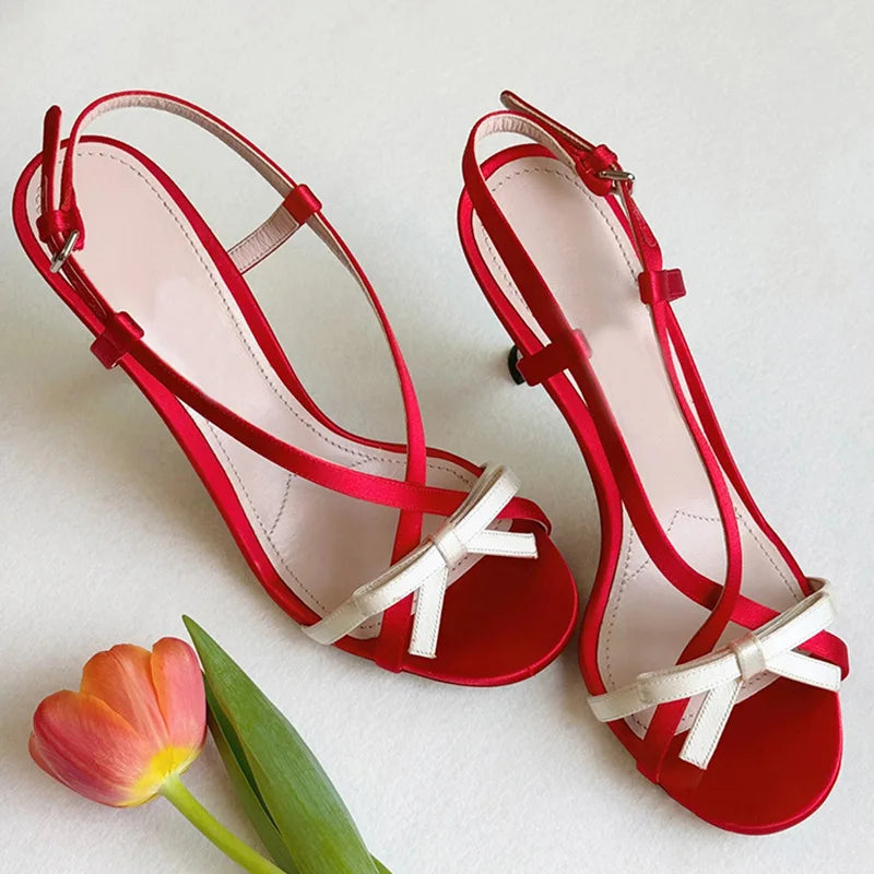 LIZAKOSHT - Sweet Bowknot Open Toe Thin Heeled Sandals Women 2024 Summer Sexy Narrow Buckle High Heels Elegant Wedding Dress Shoes Red Pumps