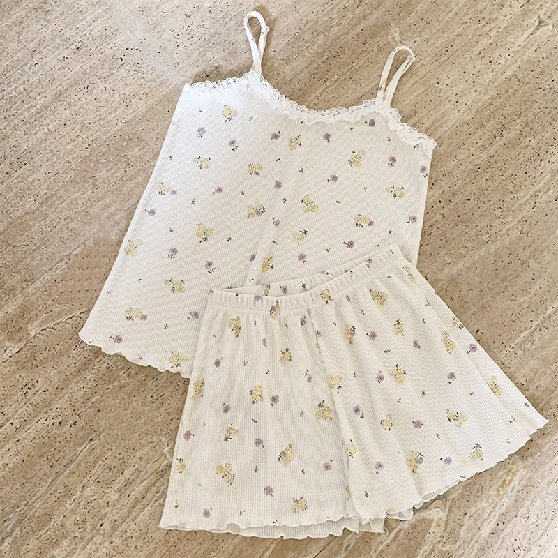 Lizakosht Sweet Floral Pattern Pajama Sets Women Summer Lace Trim Homewear Cute Sleepwear Kawaii Pajamas Top and Shorts